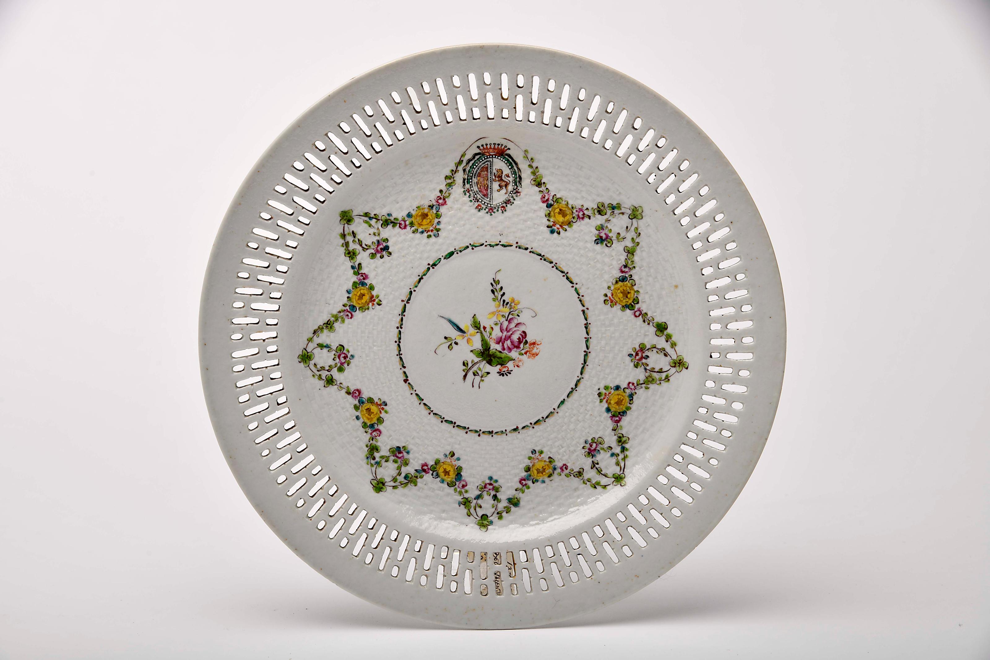 Base de cesto redondo com aba vazada porcelana Chinesa de exportação decoração policromada e dourada "Grinalda de flores" com armas de José Seabra da Silva (1732-1813) - 2º serviço reinado Qianlong (1736-1795) desgaste no dourado do bordo Dimensões (altura x comprimento x largura) - 24,3 cm Notas: vd. CASTRO, Nuno - "A Porcelana Chinesa ao Tempo do Império - Portugal / Brasil". Lisboa: ACD Editores, 2007, p. 160; SANTOS, A. Varela - "Portugal na Porcelana da China - 500 Anos de Comércio", Volume III. Lisboa: Artemágica, 2009, pp. 912-916; e DIAS, Pedro – “Heráldica Portuguesa na Porcelana da China Qing”. Lisboa: Fundação Macau, 2014, pp. 146-147.