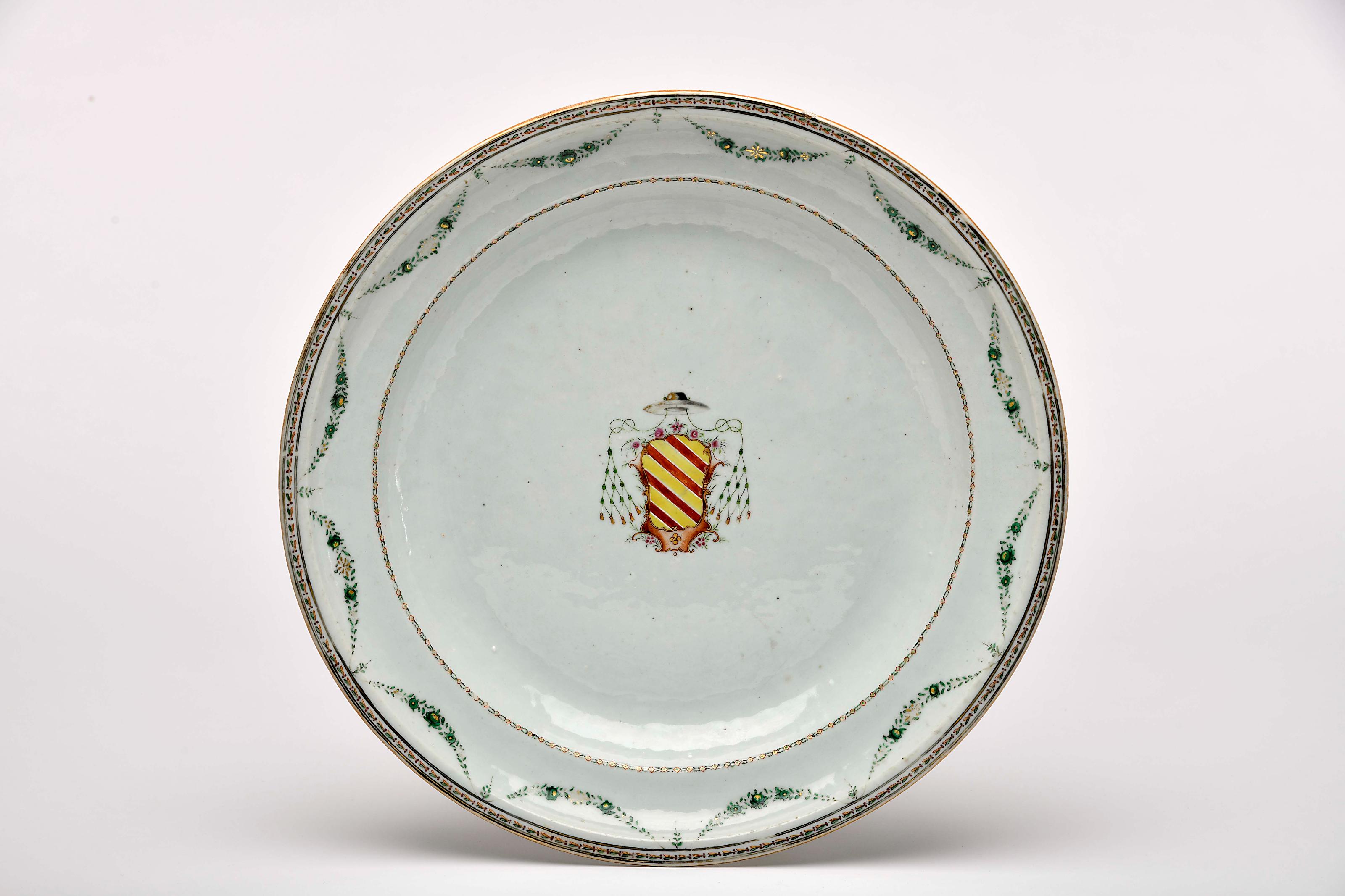 Prato fundo redondo grande porcelana Chinesa de exportação decoração policromada e dourada com armas de D. Joaquim Xavier Botelho de Lima Távora, Arcebispo de Évora - 1º serviço reinado Qianlong (1736-1795) grande esbeiçadela no verso do bordo, faltas na decoração Dimensões (altura x comprimento x largura) - 38 cm Notas: vd. CASTRO, Nuno - "A Porcelana Chinesa ao Tempo do Império - Portugal/Brasil". Lisboa: ACD Editores, 2007, p. 162; SANTOS, A. Varela - "Portugal na Porcelana da China: 500 Anos de Comércio", Lisboa: Artemágica, 2008, vol. II, pp. 636-639, nº 5.07; e DIAS, Pedro - "Heráldica Portuguesa na Porcelana da China Qing". Lisboa: Fundação Macau, 2014, pp. 212-215.