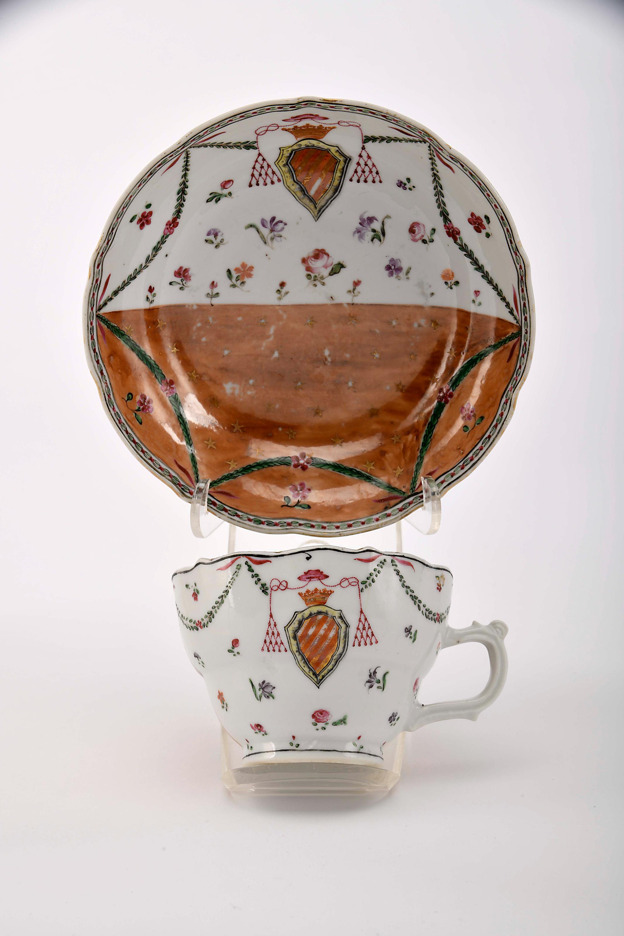 Chávena com pires recortados porcelana Chinesa de exportação decoração «noite-e-dia» a castanho, policromado e dourado com armas de D. Joaquim Xavier Botelho de Lima Távora (1717-1800), arcebispo de Évora - 2º serviço reinado Qianlong (1736-1795) chávena com cabelo, desgaste na decoração Dimensões (altura x comprimento x largura) - (chávena) 6 x 8,6 cm; (pires) 13,2 cm Notas: vd. CASTRO, Nuno de - "A Porcelana Chinesa ao Tempo do Império - Portugal/Brasil". Lisboa: ACD Editores, 2007, p. 162; SANTOS, A. Varela - "Portugal na Porcelana da China - 500 Anos de Comércio" - vol. II. Lisboa: Artemágica, 2008, p. 641; e DIAS, Pedro - "Heráldica Portuguesa na Porcelana da China Qing". Lisboa: Fundação Macau, 2014, pp. 212-215.