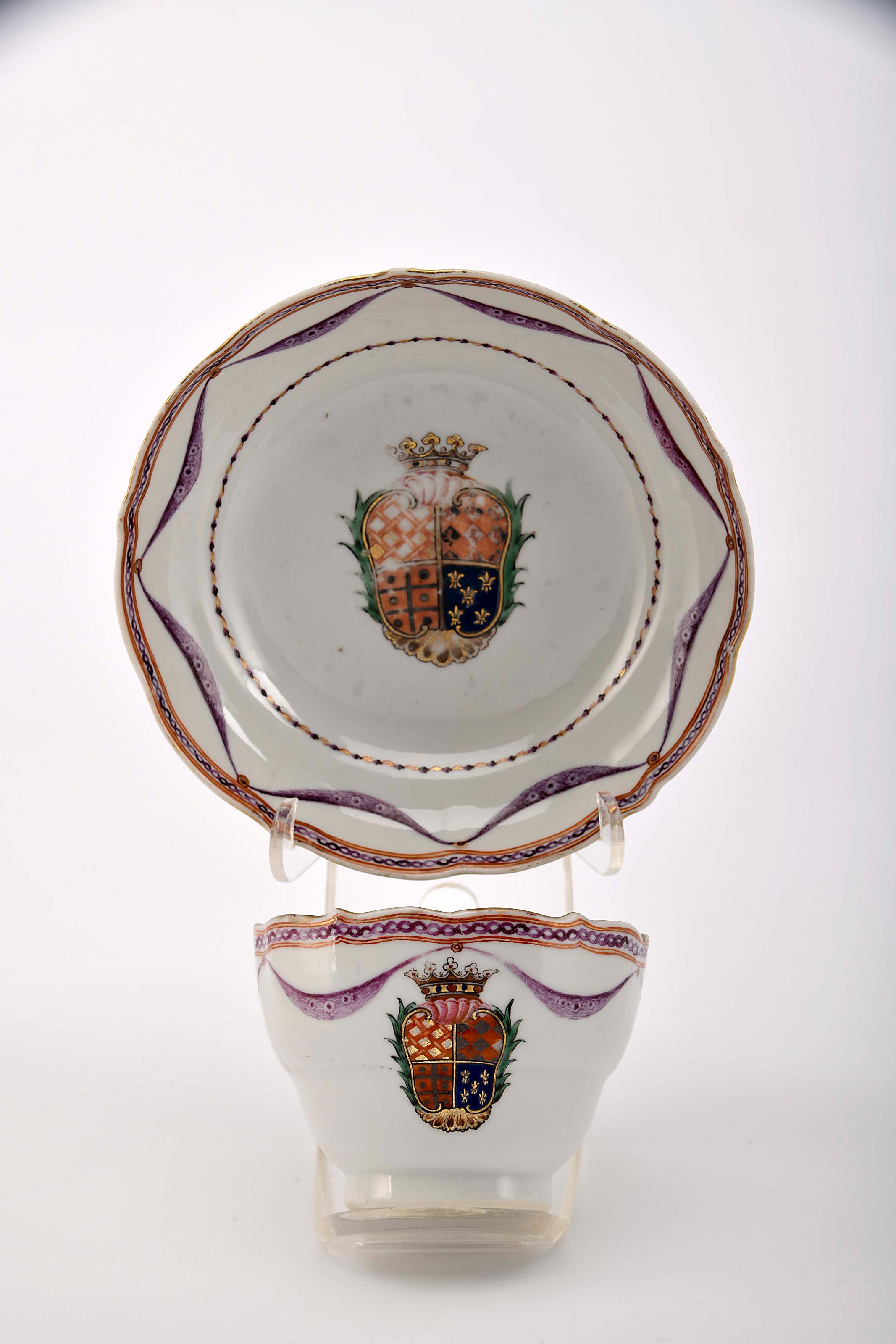 Chávena com pires recortados porcelana Chinesa de exportação decoração policromada e dourada com armas de José Correia de Melo e Brito de Alvim reinado Qianlong (1736-1795) pires com cabelo, ínfimas esbeiçadelas, acentuado desgaste no brasão do pires, ligeiro desgaste no dourado Dimensões (altura x comprimento x largura) - (chávena) 5,9 x 8,7 cm; (pires) 13,9 cm Notas: vd. CASTRO, Nuno de - "A Porcelana Chinesa ao Tempo do Império - Portugal/Brasil". Lisboa: ACD Editores, 2007, p. 165; SANTOS, A. Varela - "Portugal na Porcelana da China - 500 Anos de Comércio", Volume III. Lisboa: Artemágica, 2009, pp. 917-921; e DIAS, Pedro - "Heráldica Portuguesa na Porcelana da China Qing". Lisboa: Fundação Macau, 2014, pp. 148-149.
