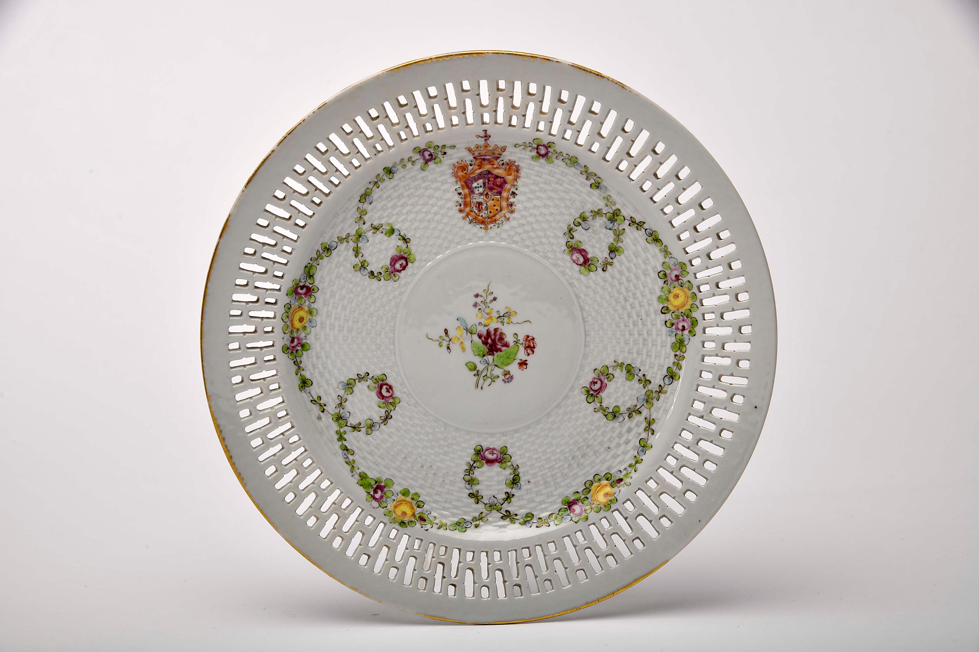 Base redonda de cesto com aba vazada porcelana Chinesa de exportação decoração policromada e dourada com armas de D. Diogo José Vito de Menezes de Noronha Coutinho (1739-1803), 5º marquês de Marialva reinado Qianlong (1736-1795) desgaste no dourado do bordo Dimensões (altura x comprimento x largura) - 24,1 cm Notas: vd. CASTRO, Nuno de - "A Porcelana Chinesa ao Tempo do Império - Portugal-Brasil". Lisboa: ACD Editores, 2007, p. 167; SANTOS, A. Varela - "Portugal na Porcelana da China: 500 Anos de Comércio", Lisboa: Artemágica, 2009, vol. III, pp. 922-931; e DIAS, Pedro - "Heráldica Portuguesa na Porcelana da China Qing". Lisboa: Fundação Macau, 2014, pp. 150-155.Verso com etiqueta comercial de J. REIS FERNANDES - LONDON.