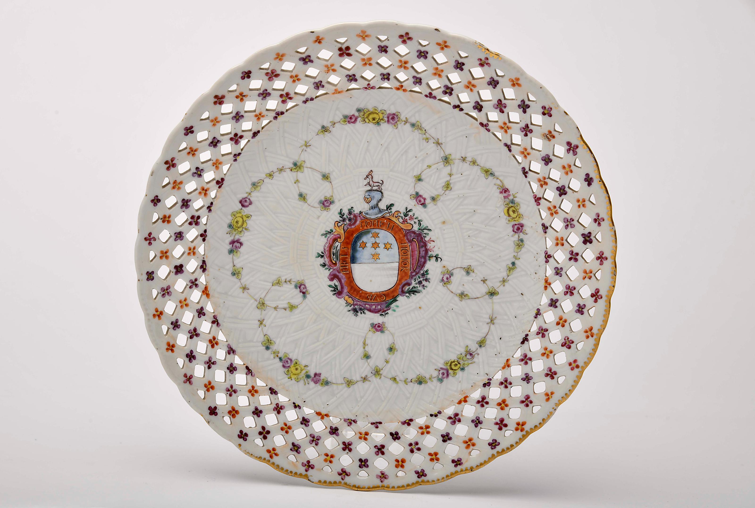 Base redonda de cesto com aba vazada porcelana Chinesa de exportação decoração policromada e dourada com armas de Joaquim Inácio da Cruz Sobral (1725-1781) - 4º serviço (cinco grinaldas), fundo relevado "Cesto" reinado Qianlong (1736-1795) desgaste no dourado Dimensões (altura x comprimento x largura) - 23,3 cm Notas: vd. CASTRO, Nuno de - "A Porcelana Chinesa ao Tempo do Império - Portugal/Brasil". Lisboa: ACD Editores, 2007, p. 170; SANTOS, A. Varela - "Portugal na Porcelana da China - 500 Anos de Comércio", volume IV. Lisboa: Artemágica, 2010, pp. 1098-1101; e DIAS, Pedro – “Heráldica Portuguesa na Porcelana da China Qing”. Lisboa: Fundação Macau, 2014, pp. 192-205.