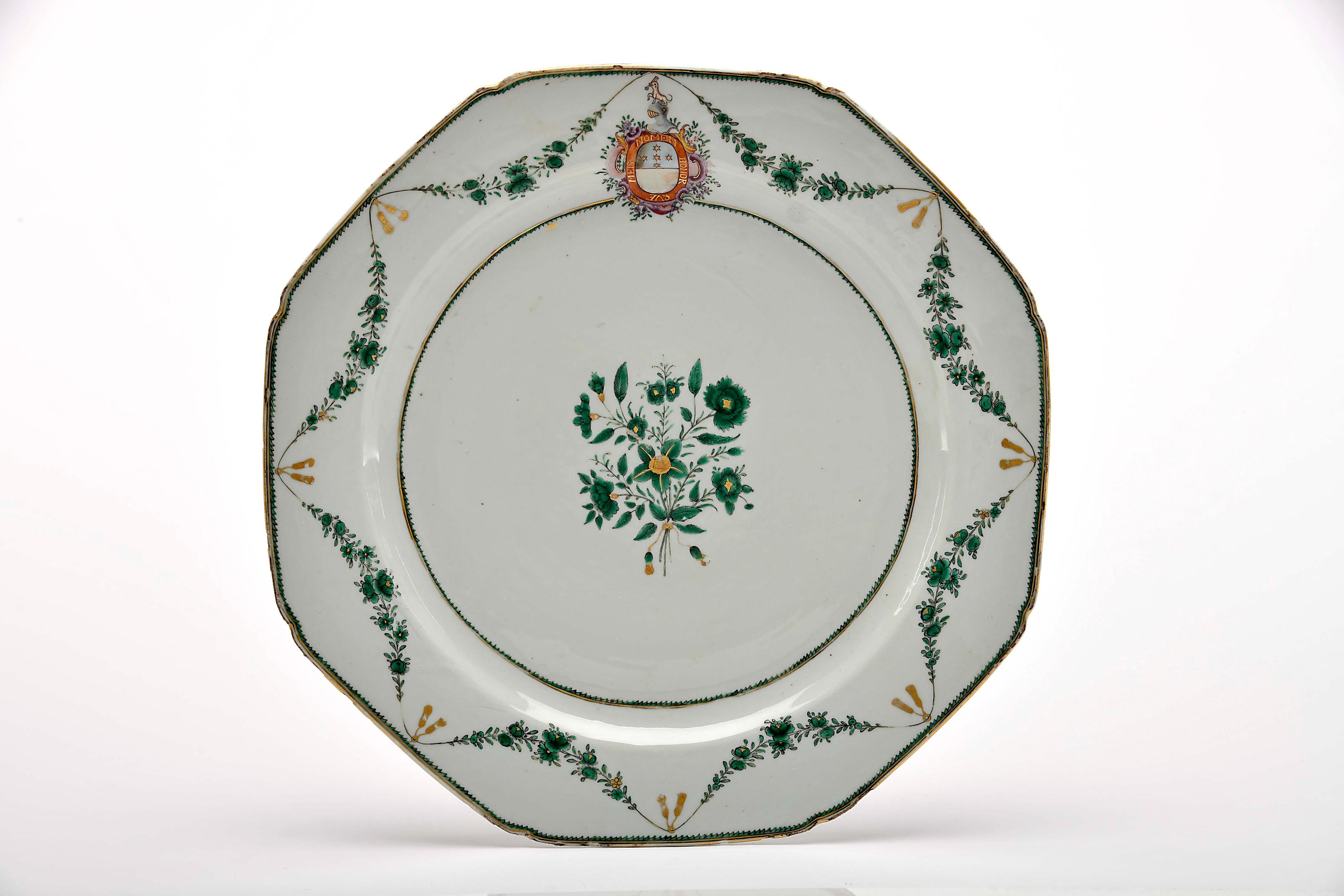 Prato de sopa oitavado porcelana Chinesa de exportação decoração a verde e dourado com armas policromadas de Joaquim Inácio da Cruz Sobral - 5º serviço (oito grinaldas) reinado Qianlong (1736-1795) esbeiçadelas Dimensões (altura x comprimento x largura) - 22 cm Notas: vd. CASTRO, Nuno - "A Porcelana Chinesa ao Tempo do Império - Portugal / Brasil". Lisboa: ACD Editores, 2007, p. 170; SANTOS, A. Varela - "Portugal na Porcelana da China: 500 Anos de Comércio", vol. IV. Lisboa: Artemágica, 2010, pp. 1102-1106; e DIAS, Pedro - "Heráldica Portuguesa na Porcelana da China Qing". Lisboa: Fundação Macau, 2014, pp. 192-205..