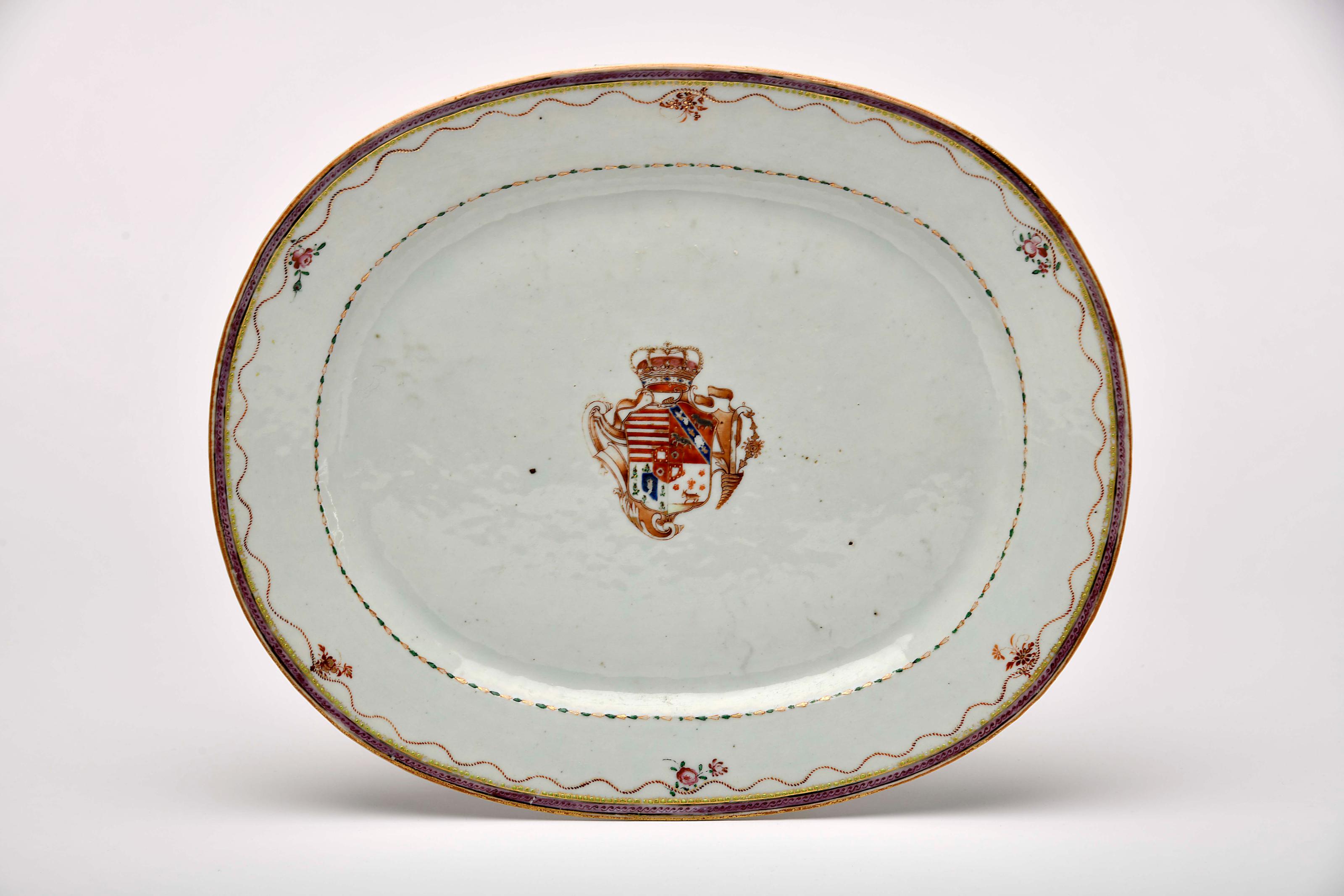 Travessa oval porcelana Chinesa de exportação decoração policromada e dourada com armas de José Pamplona Carneiro Rangel Baldaia de Tovar (c. 1750-1815) - 1º serviço (erradamente com coroa real) reinado Qianlong (1736-1795) algum desgaste na decoração do brasão Dimensões (altura x comprimento x largura) - 37,5 x 31,4 cm Notas: vd. CASTRO, Nuno de - "A Porcelana Chinesa ao Tempo do Império - Portugal/Brasil". Lisboa: ACD Editores, 2007, p. 173; SANTOS, A. Varela - "Portugal na Porcelana da China: 500 Anos de Comércio". Lisboa: Artemágica - vol. IV, 2010, pp. 1202-1211; e DIAS, Pedro - "Heráldica Portuguesa na Porcelana da China Qing". Lisboa: Fundação Macau, 2014, pp. 168-171.