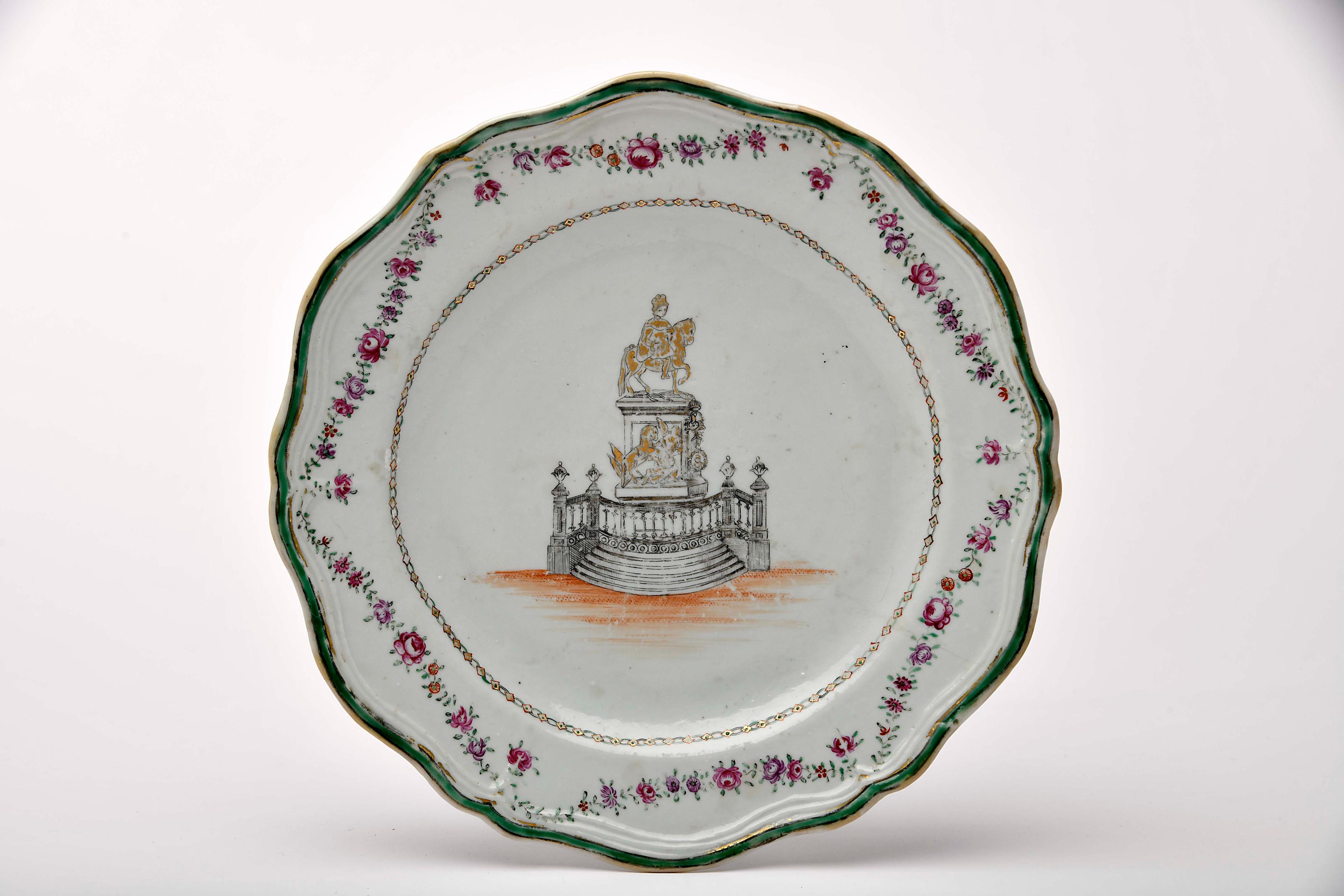 Prato recortado porcelana Chinesa de exportação decoração policromada e dourada "Estátua Equestre de D. José" - serviço comemorativo da sua inauguração em 1775 reinado Qianlong (1736-1795) cabelo, esbeiçadelas restauradas, algum desgaste na decoração Dimensões (altura x comprimento x largura) - 23,8 cm Notas: integrou a Colecção Rafi Y Mottaheded conforme a etiqueta colada no verso.Vd. CASTRO, Nuno - "A Porcelana Chinesa ao Tempo do Império - Portugal/Brasil". Lisboa: ACD Editores, 2007, p. 275; VEIGA, Jorge Getúlio - "Chinese Export Porcelain in Private Brasilian Collections". London: Han-Shan Tang, 1989, p. 275; BEURDELEY, Michel - Porcelaine de la Compagnie des Indes. Fribourg: Office du Livre, 1962, p. 80, fig. 52; e HERVOUET, François et Nicole; BRUNEAU, Yves - "La Porcelaine des Compagnies des Indes à Décor Occidental". Paris: Flammarion, 1986, p. 231, nº 9.110.Verso com etiqueta comercial de JORGE WELSH.