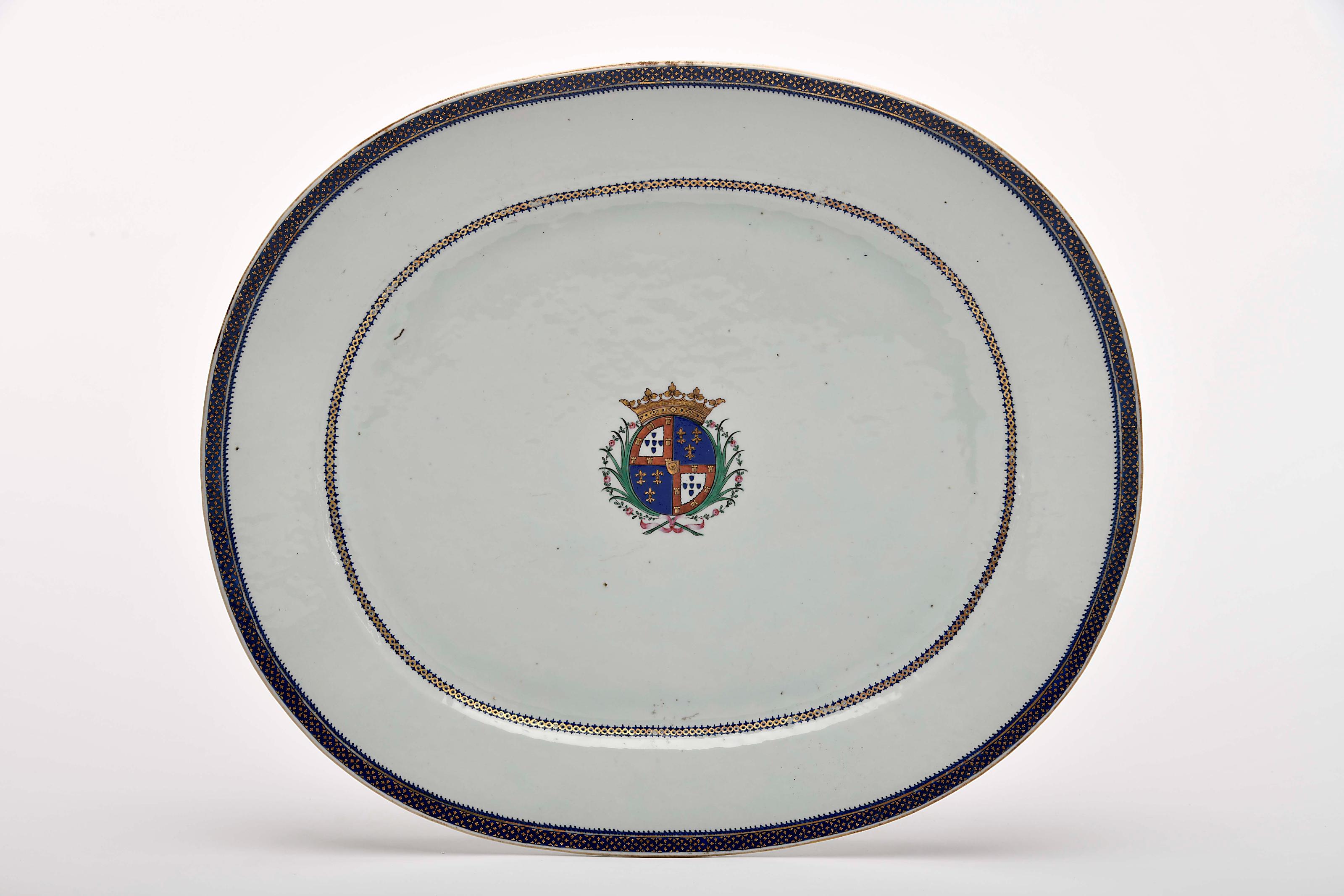 Travessa oval grande porcelana Chinesa de exportação decoração a azul e dourado com armas policromadas de D. Henrique de Meneses (1745-1812), 3º marquês de Louriçal e 7º conde da Ericeira reinado Qianlong (1736-1795) ligeiro desgaste na decoração Dimensões (altura x comprimento x largura) - 44,5 x 38,2 cm Notas: vd. CASTRO, Nuno de - "A Porcelana Chinesa ao Tempo do Império - Portugal/Brasil". Lisboa: ACD Editores, 2007, p. 184; SANTOS, A. Varela - "Portugal na Porcelana da China - 500 Anos de Comércio" - vol. IV. Lisboa: Artemágica, 2009, p. 1244-1246; e DIAS, Pedro - "Heráldica Portuguesa na Porcelana da China Qing". Lisboa: Fundação Macau, 2014, pp. 208-209.