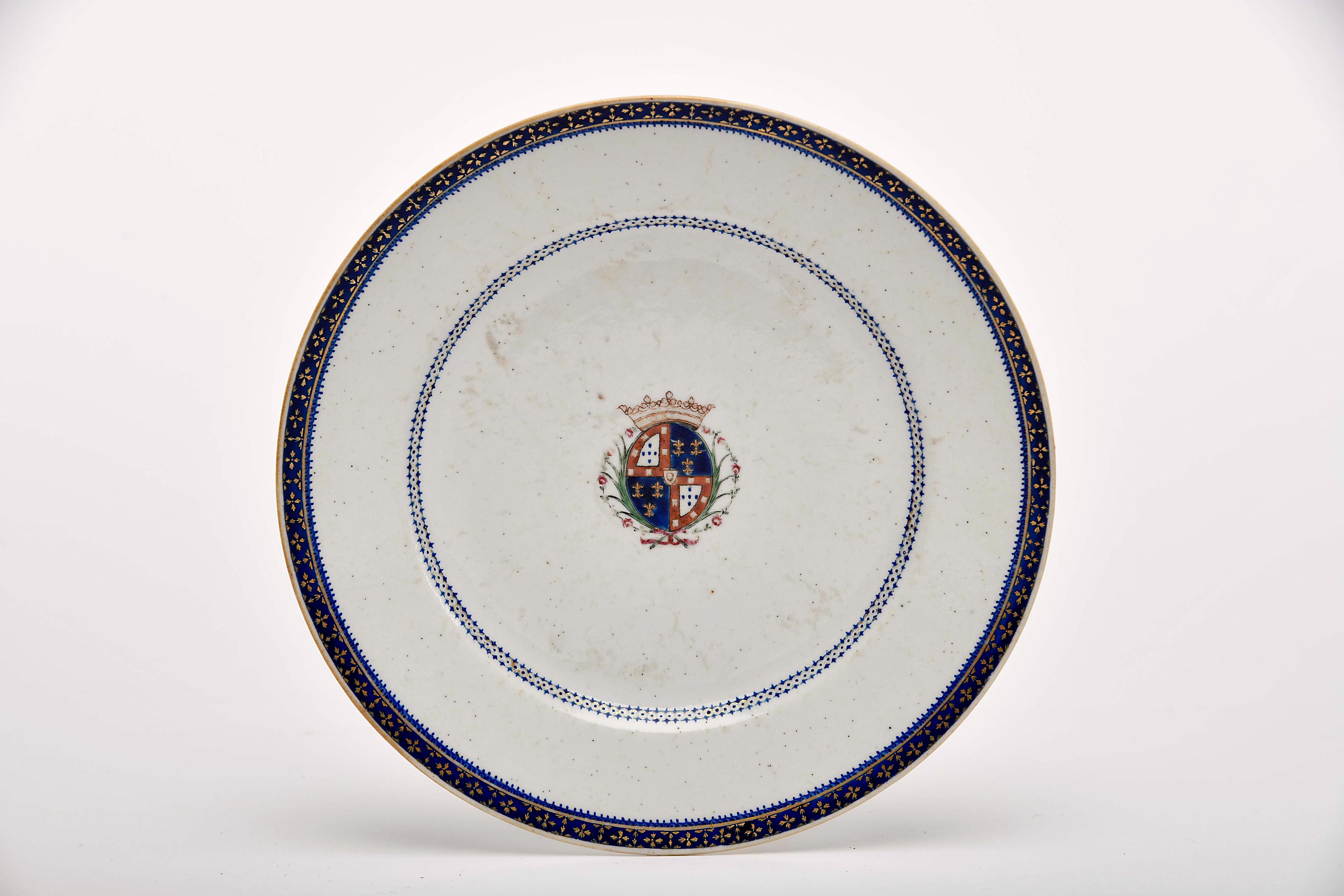 Prato porcelana Chinesa de exportação decoração a azul e dourado com armas policromadas de D. Henrique de Meneses (1745-1812), 3º marquês de Louriçal e 7º conde da Ericeira reinado Qianlong (1736-1795) ligeiro restauro na decoração, desgaste no vidrado, pequenos defeitos de fabrico Dimensões (altura x comprimento x largura) - 23 cm Notas: vd. CASTRO, Nuno de - "A Porcelana Chinesa ao Tempo do Império - Portugal/Brasil". Lisboa: ACD Editores, 2007, p. 184; SANTOS, A. Varela - "Portugal na Porcelana da China - 500 Anos de Comércio" - vol. IV. Lisboa: Artemágica, 2009, p. 1244-1246; e DIAS, Pedro - "Heráldica Portuguesa na Porcelana da China Qing". Lisboa: Fundação Macau, 2014, pp. 208-209.