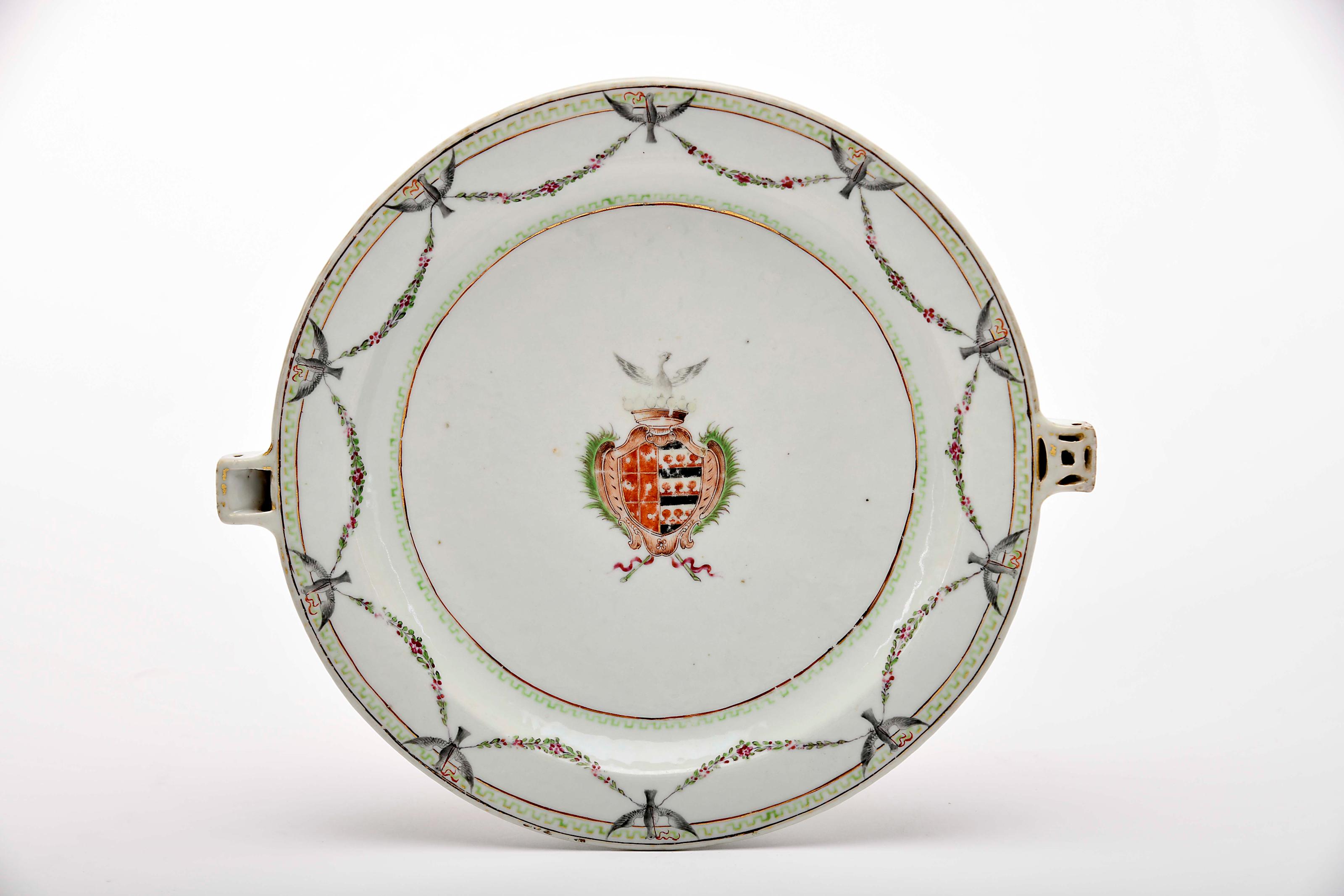 Prato de rechaud porcelana Chinesa de exportação decoração policromada e dourada com armas de Francisco de Melo e Vasconcelos reinado Qianlong (1736-1795) pequenas esbeiçadelas, ligeiro desgaste na decoração Dimensões (altura x comprimento x largura) - 28 x 25 cm Notas: vd. CASTRO, Nuno de - "A Porcelana Chinesa ao Tempo do Império - Portugal/Brasil". Lisboa: ACD Editores, 2007, p. 185; SANTOS, A. Varela - "Portugal na Porcelana da China: 500 Anos de Comércio". Lisboa: Artemágica, 2010, volume IV, pp. 1164-1168; e DIAS, Pedro - "Heráldica Portuguesa na Porcelana da China Qing". Lisboa: Fundação Macau, 2014, pp. 206-207.