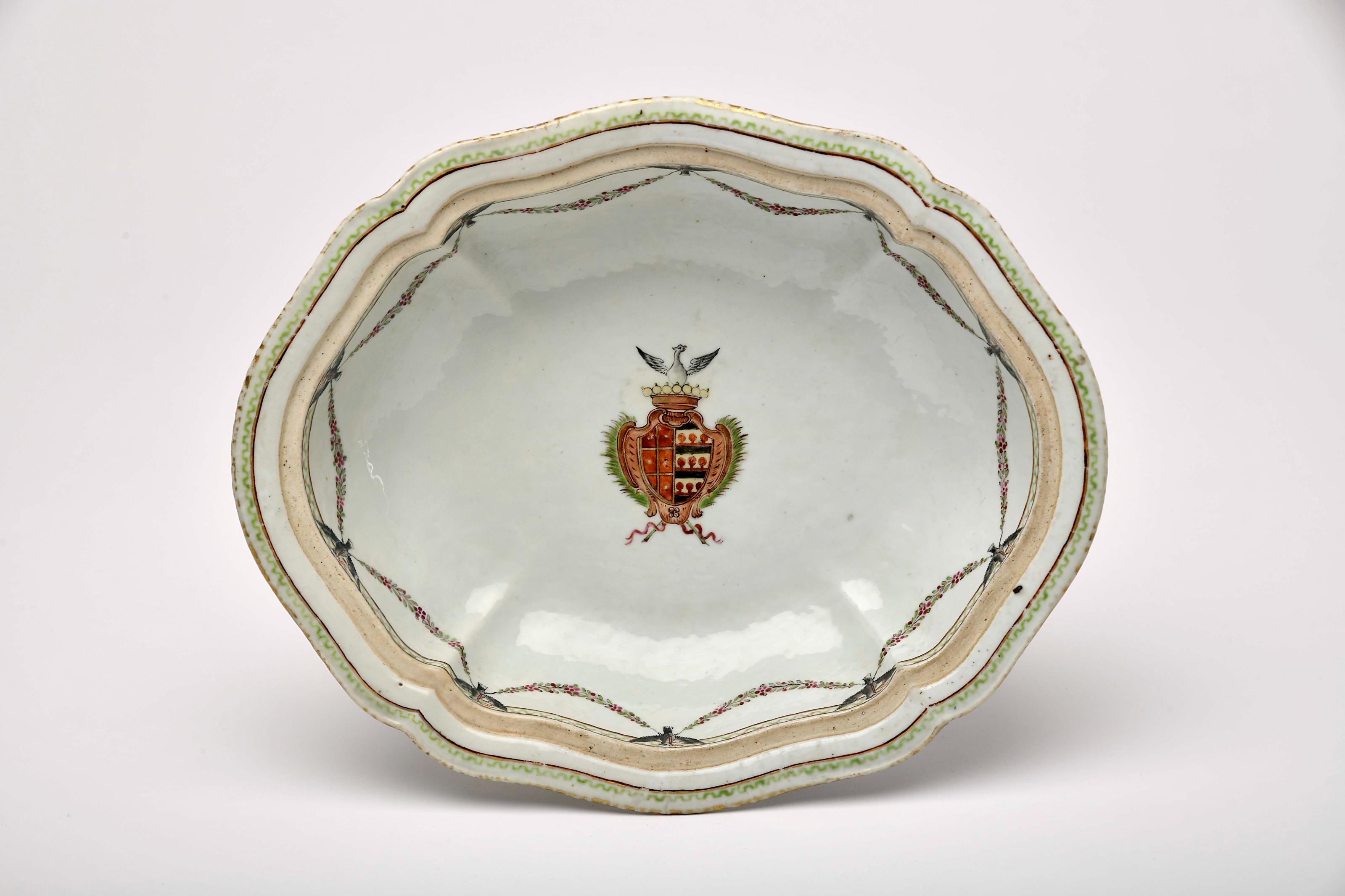 Alma de prato coberto recortado porcelana Chinesa de exportação decoração policromada e dourada com armas de Francisco de Melo e Vasconcelos reinado Qianlong (1736-1795) falta da tampa, restaurada, cabelos, esbeiçadelas, ligeiro desgaste no dourado Dimensões (altura x comprimento x largura) - 7,7 x 31,5 x 26 cm Notas: vd. CASTRO, Nuno de - "A Porcelana Chinesa ao Tempo do Império - Portugal/Brasil". Lisboa: ACD Editores, 2007, p. 185; SANTOS, A. Varela - "Portugal na Porcelana da China: 500 Anos de Comércio". Lisboa: Artemágica, 2010, volume IV, pp. 1164-1168; e DIAS, Pedro - "Heráldica Portuguesa na Porcelana da China Qing". Lisboa: Fundação Macau, 2014, pp. 206-207.