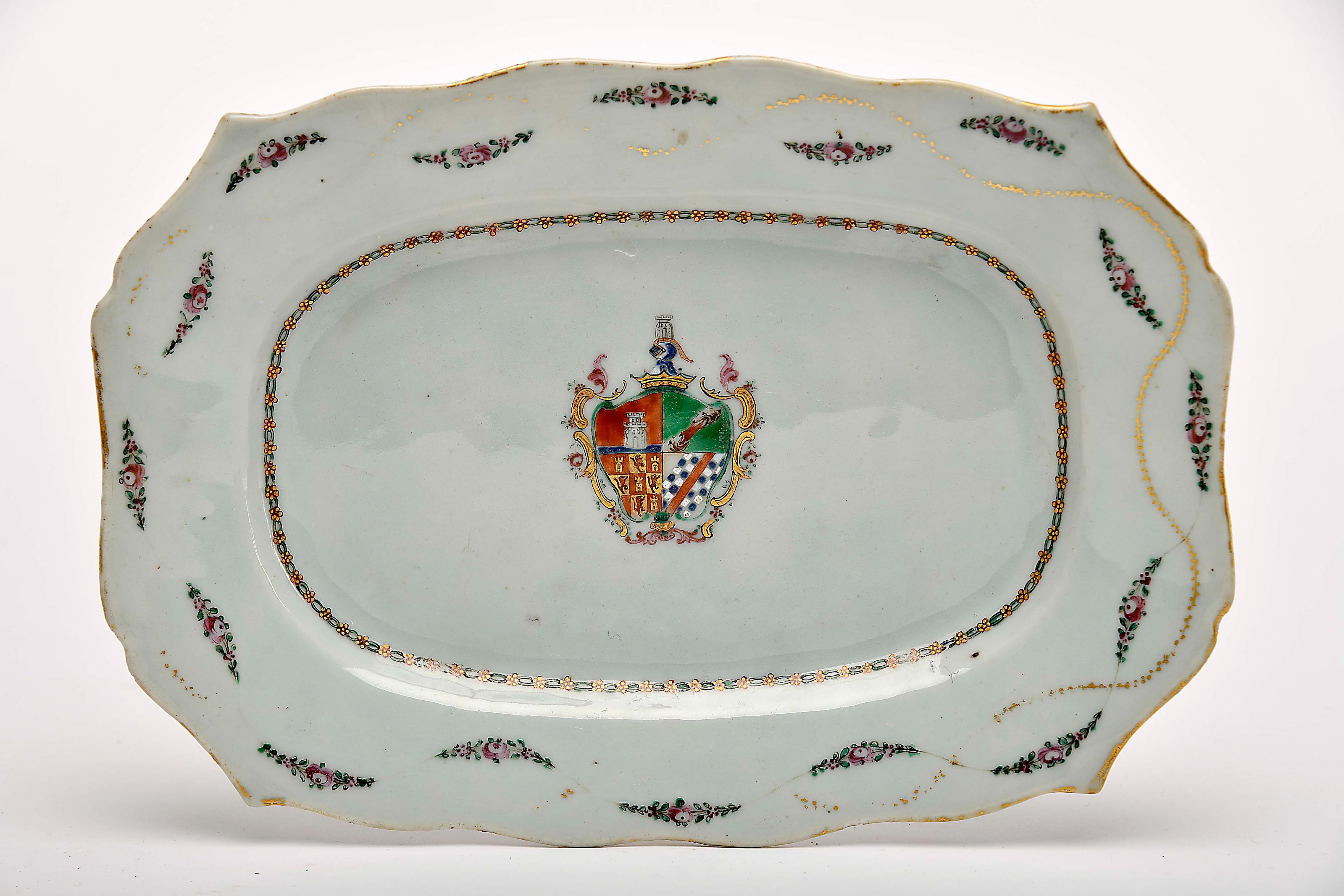 Travessa recortada pequena porcelana Chinesa de exportação decoração policromada e dourada com armas de Pedro António de Pina Manique Nogueira Matos de Andrade (1773-1839) - 1º visconde de Manique do Intendente reinado Qianlong (1736-1795) pequenas faltas no vidrado do bordo, desgaste na decoração Dimensões (altura x comprimento x largura) - 26,5 x 18,8 cm Notas: vd. CASTRO, Nuno de - "A Porcelana Chinesa ao Tempo do Império - Portugal/Brasil". Lisboa: ACD Editores, 2007, p. 187; SANTOS, A. Varela - "Portugal na Porcelana da China - 500 Anos de Comércio" - volume III. Lisboa: Artemágica, 2009, pp. 936-94, nº 6.24 ; e DIAS, Pedro - "Heráldica Portuguesa na Porcelana da China Qing". Lisboa: Fundação Macau, 2014, pp. 162-163, sendo que os dois últimos autores atribuem a encomenda a Diogo Inácio de Pina Manique (1733-1805), pai do primeiro visconde de Manique do Intendente.
