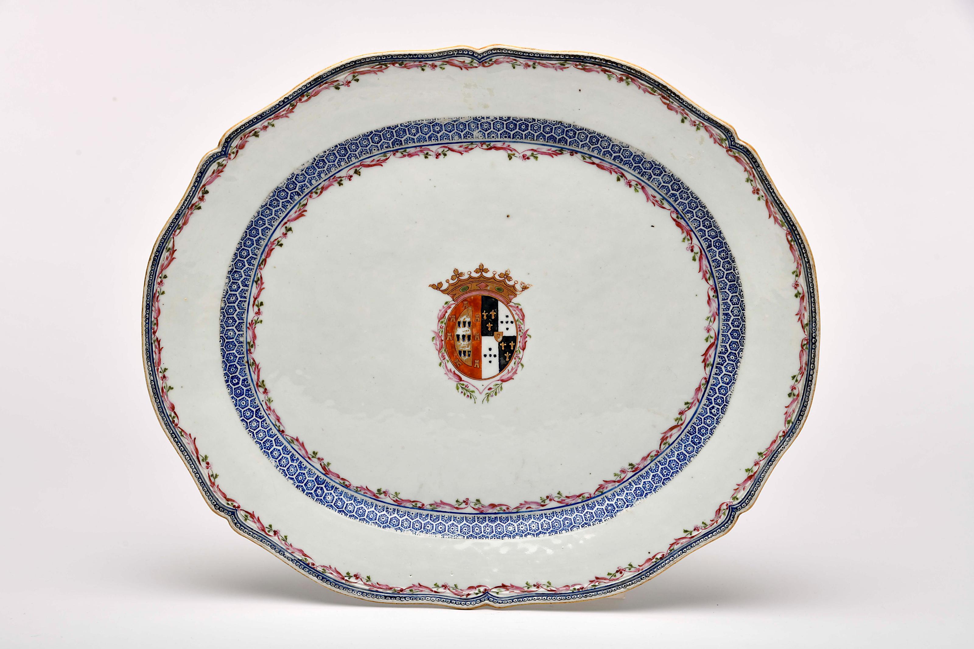 Travessa recortada grande porcelana Chinesa de exportação decoração policromada e dourada com armas de Francisco da Cunha e Meneses (1741-1812) reinado Qianlong (1736-1795) ligeiro desgaste na decoração Dimensões (altura x comprimento x largura) - 41,5 x 34,8 cm Notas: vd. CASTRO, Nuno - “A Porcelana Chinesa ao Tempo do Império - Portugal/Brasil”. Lisboa: ACD Editores, 2007, p. 194; SANTOS, A. Varela - "Portugal na Porcelana da China - 500 Anos de Comércio", vol. IV. Lisboa: Artemágica, 2010, pp. 1218-1224, nº 6.46; e DIAS, Pedro - “Heráldica Portuguesa na Porcelana da China Qing”. Lisboa: Fundação Macau, 2014, pp. 222-225.