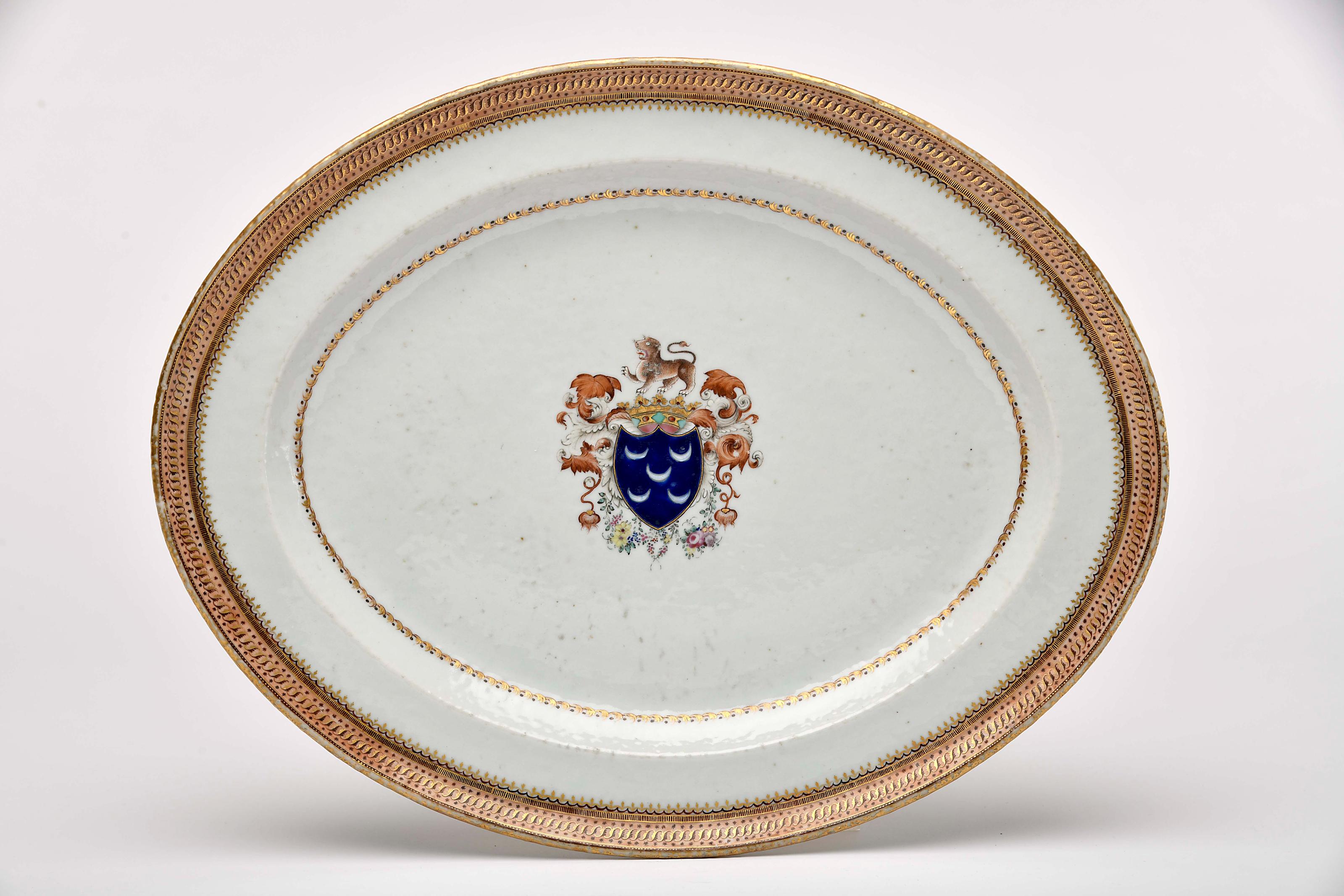Travessa oval porcelana Chinesa de exportação decoração policromada e dourada com armas de Luís Pinto de Sousa Coutinho (1735-1804), 1º visconde de Balsemão - 1º serviço reinado Jiaqing (1796-1820) ligeiro desgaste na decoração Dimensões (altura x comprimento x largura) - 40,7 x 32,2 cm Notas: vd. CASTRO, Nuno de - "A Porcelana Chinesa ao Tempo do Império - Portugal/Brasil". Lisboa: ACD Editores, 2007, p. 205; e DIAS, Pedro - "Heráldica Portuguesa na Porcelana da China Qing". Lisboa: Fundação Macau, 2014, pp. 238-241.