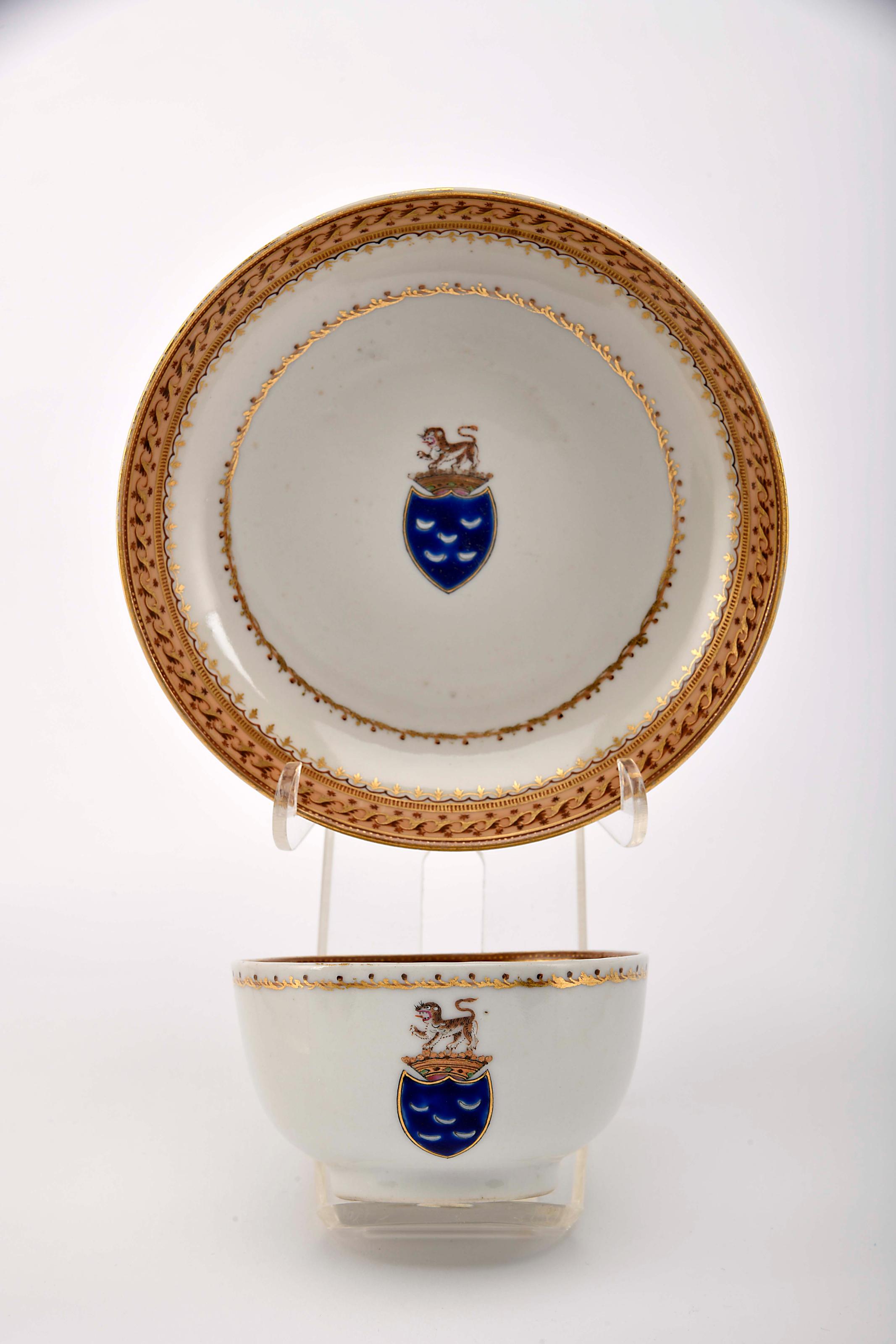 Chávena com pires porcelana Chinesa de exportação decoração policromada e dourada com armas de Luís Pinto de Sousa Coutinho (1735-1804), 1º visconde de Balsemão - 2º serviço reinado Jiaqing (1796-1820) cabelos, ligeiro desgaste no dourado Dimensões (altura x comprimento x largura) - (chávena) 4,8 x 8,6 cm; (pires) 13,9 cm Notas: vd. CASTRO, Nuno de - "A Porcelana Chinesa ao Tempo do Império - Portugal/Brasil". Lisboa: ACD Editores, 2007, p. 205; e DIAS, Pedro - "Heráldica Portuguesa na Porcelana da China Qing". Lisboa: Fundação Macau, 2014, pp. 238-241.