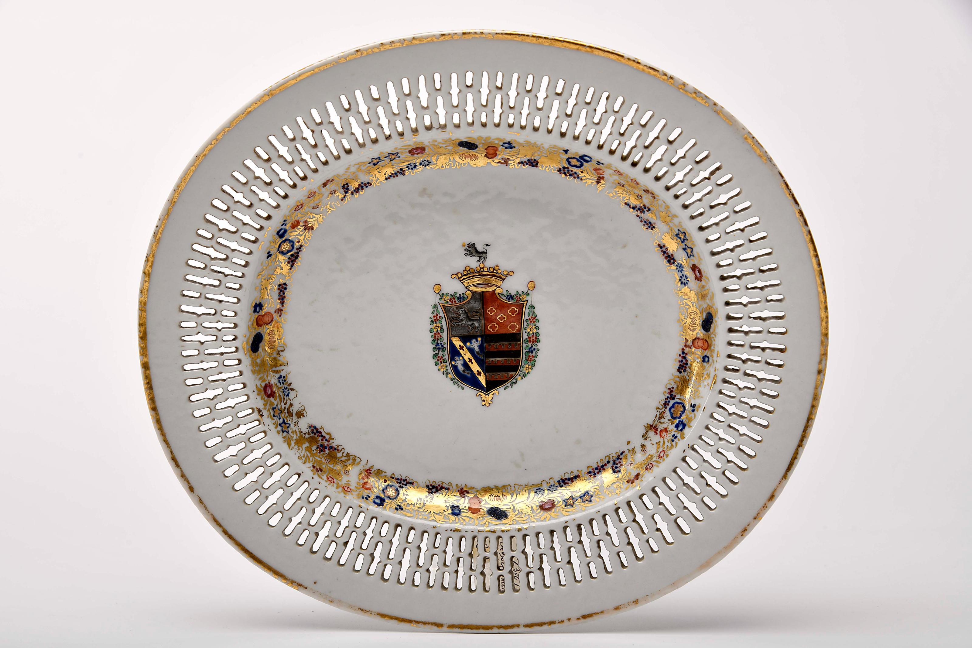 Base oval de cesto com aba vazada porcelana Chinesa de exportação decoração policromada e dourada com armas de Vital de Bettencourt de Vasconcelos e Lemos (1751-1847) reinado Jiaqing (1796-1820) desgaste no dourado Dimensões (altura x comprimento x largura) - 3,4 x 25,9 x 23 cm Notas: vd. CASTRO, Nuno - "A Porcelana Chinesa ao Tempo do Império - Portugal / Brasil". Lisboa: ACD Editores, 2007, p. 206; e DIAS, Pedro - "Heráldica Portuguesa na Porcelana da China Qing". Lisboa: Fundação Macau, 2014, pp. 264-267.