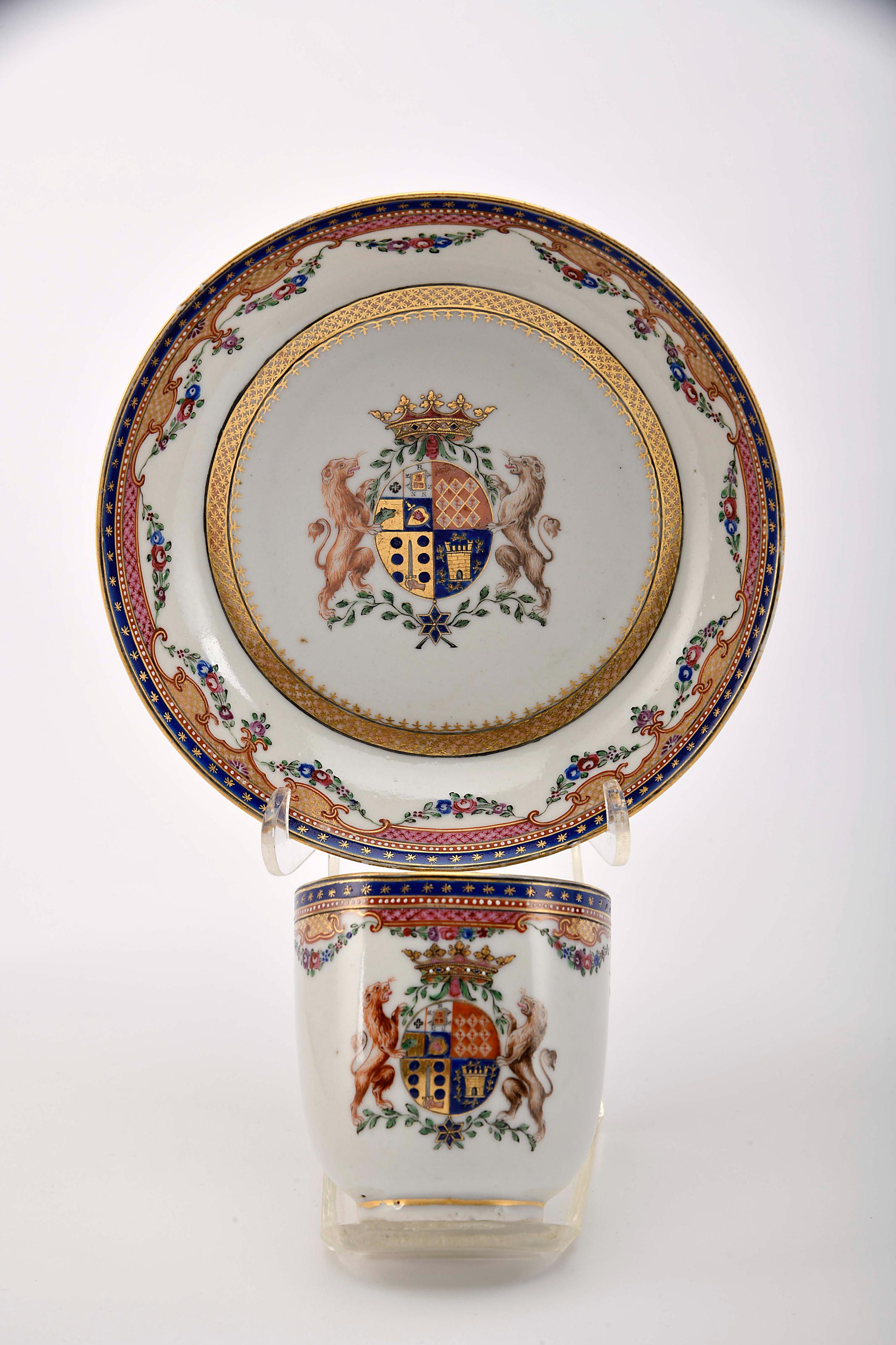 Chávena com pires porcelana Chinesa de exportação decoração policromada e dourada com armas de Luís Pereira Velho de Moscoso Pé-de-Ferro (1767-18??), senhor do Palácio da Brejoeira, Monção reinado Qianlong (1736-1795) algum desgaste no dourado Dimensões (altura x comprimento x largura) - (chávena) 6,8 x 6,8 cm; (pires) 14,5 cm Notas: vd. SANTOS, A. Varela - "Portugal na Porcelana da China: 500 Anos de Comércio", Lisboa: Artemágica, 2010, vol. IV, pp. 1270-1273; e DIAS, Pedro - "Heráldica Portuguesa na Porcelana da China Qing". Lisboa: Fundação Macau, 2014, pp. 292-295.