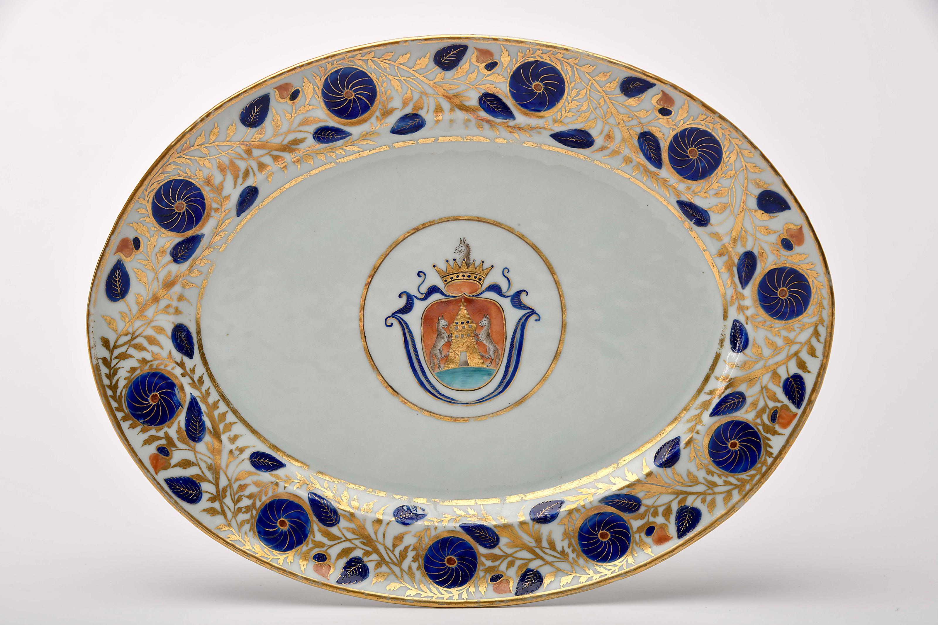 Travessa oval porcelana Chinesa de exportação decoração policromada e dourada com armas de D. José Maria Gonçalves Zarco da Câmara (1784-1820), 7º conde da Ribeira Grande - 1º serviço reinado Jiaqing (1796-1820) desgaste no dourado Dimensões (altura x comprimento x largura) - 33 x 25,5 cm Notas: vd. CASTRO, Nuno de - "A Porcelana Chinesa ao Tempo do Império - Portugal/Brasil". Lisboa: ACD Editores, 2007, p. 217; e DIAS, Pedro - "Heráldica Portuguesa na Porcelana da China Qing". Lisboa: Fundação Macau, 2014, pp. 298-301.