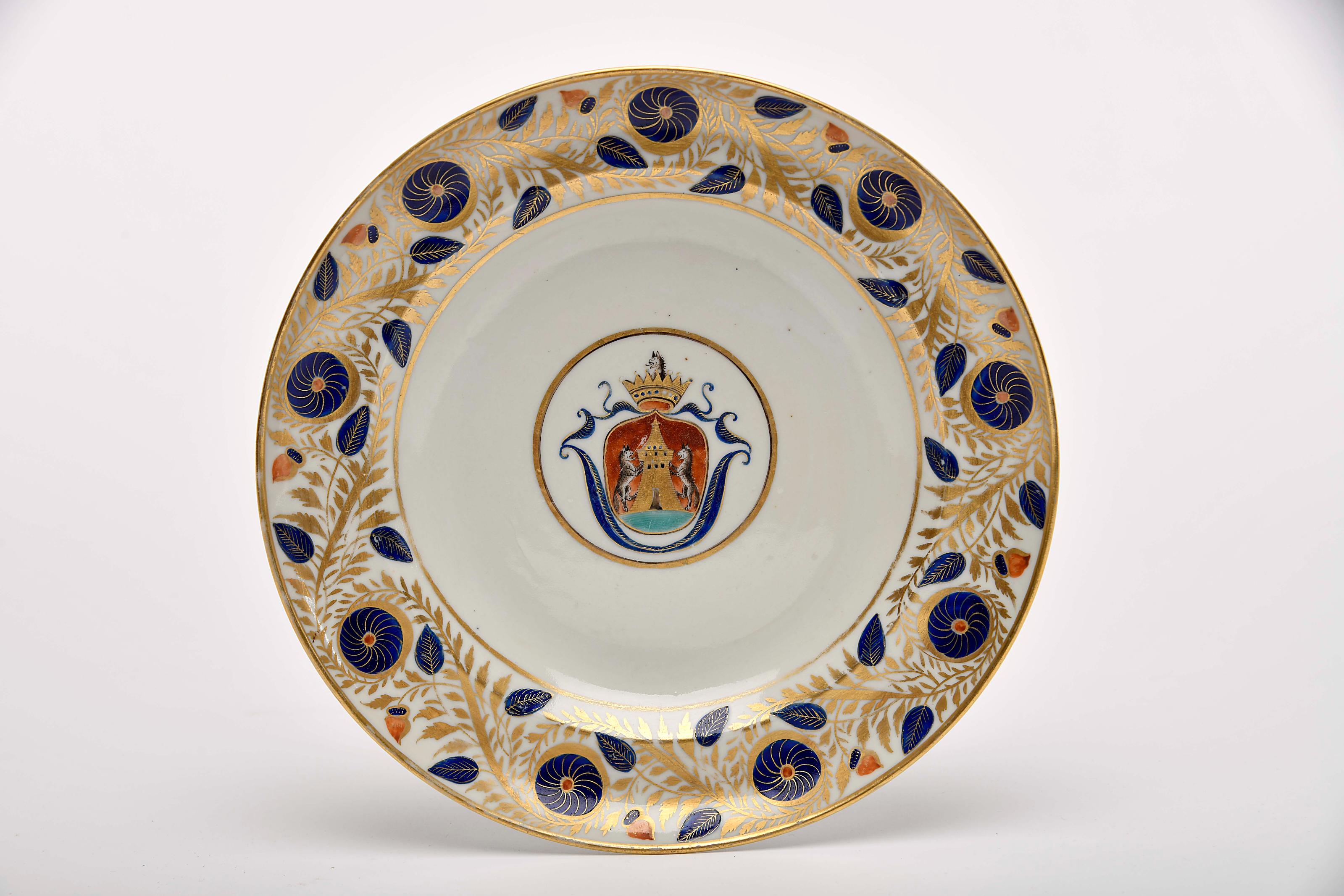 Prato de sopa porcelana Chinesa de exportação decoração policromada e dourada com armas de D. José Maria Gonçalves Zarco da Câmara (1784-1820), 7º conde da Ribeira Grande - 1º serviço reinado Jiaqing (1796-1820) pequeno cabelo, desgaste no dourado Dimensões (altura x comprimento x largura) - 25 cm Notas: vd. CASTRO, Nuno de - "A Porcelana Chinesa ao Tempo do Império - Portugal/Brasil". Lisboa: ACD Editores, 2007, p. 217; e DIAS, Pedro - "Heráldica Portuguesa na Porcelana da China Qing". Lisboa: Fundação Macau, 2014, pp. 298-301.