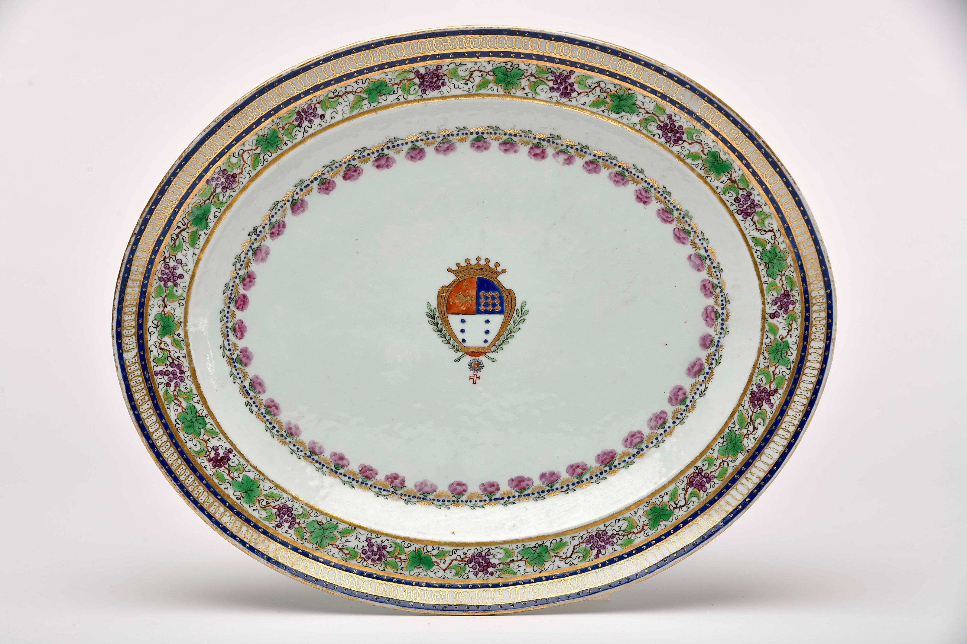 Travessa oval porcelana Chinesa de exportação decoração policromada e dourada com armas de Manuel Pais de Sande e Castro (1780-1841) reinado Jiaqing (1796-1820) ligeiro desgaste no dourado Dimensões (altura x comprimento x largura) - 40,5 x 33,5 cm Notas: vd. CASTRO, Nuno de - "A Porcelana Chinesa ao Tempo do Império - Portugal/Brasil". Lisboa: ACD Editores, 2007, p. 218; e DIAS, Pedro - "Heráldica Portuguesa na Porcelana da China Qing". Lisboa: Fundação Macau, 2014, pp. 288-289.