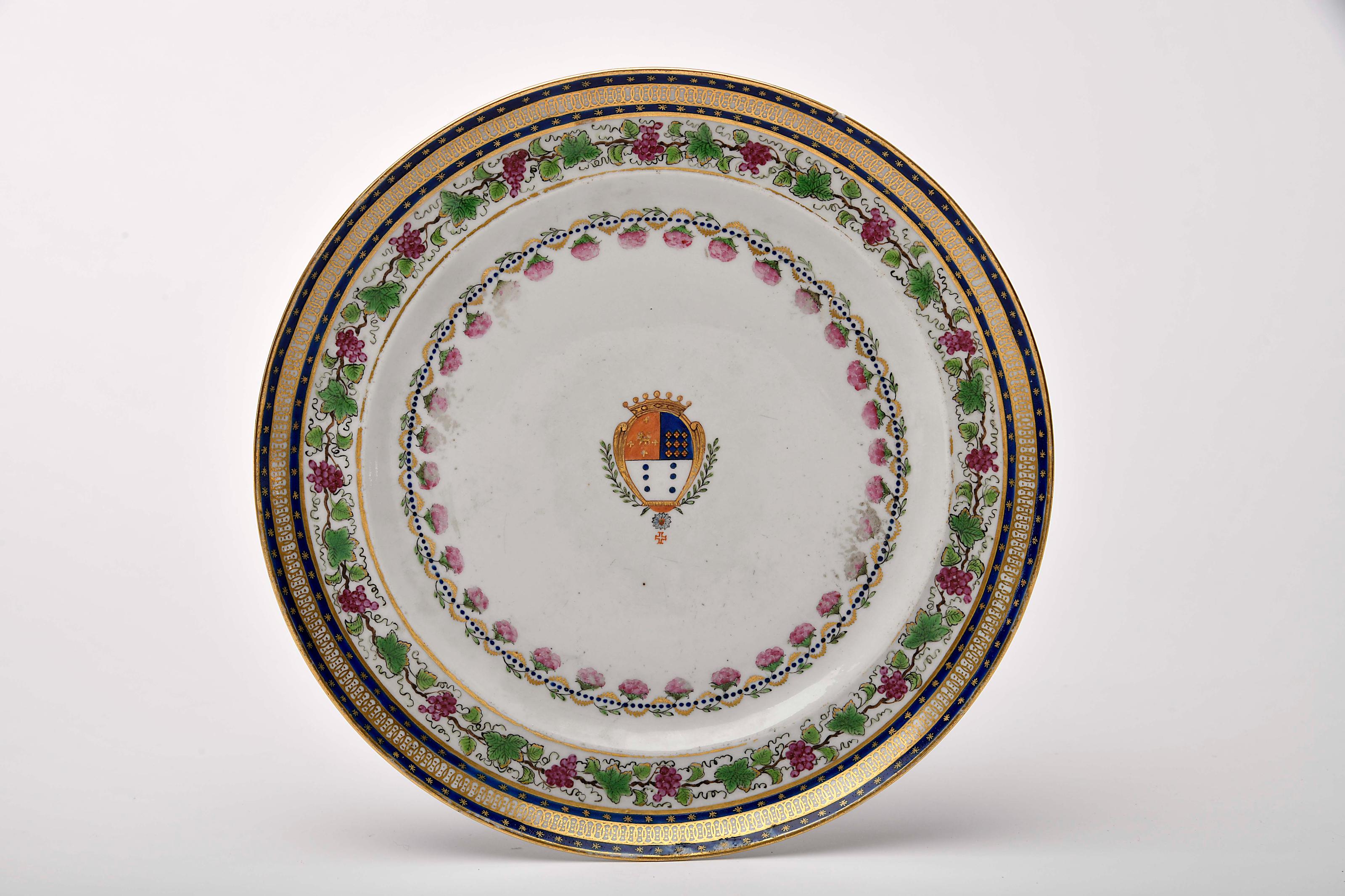 Prato porcelana Chinesa de exportação decoração policromada e dourada com armas de Manuel Pais de Sande e Castro (1780-1841) reinado Jiaqing (1796-1820) pequena falta no bordo, pequenas esbeiçadelas, desgaste na decoração Dimensões (altura x comprimento x largura) - 25 cm Notas: vd. CASTRO, Nuno de - "A Porcelana Chinesa ao Tempo do Império - Portugal/Brasil". Lisboa: ACD Editores, 2007, p. 218; e DIAS, Pedro - "Heráldica Portuguesa na Porcelana da China Qing". Lisboa: Fundação Macau, 2014, pp. 288-289.