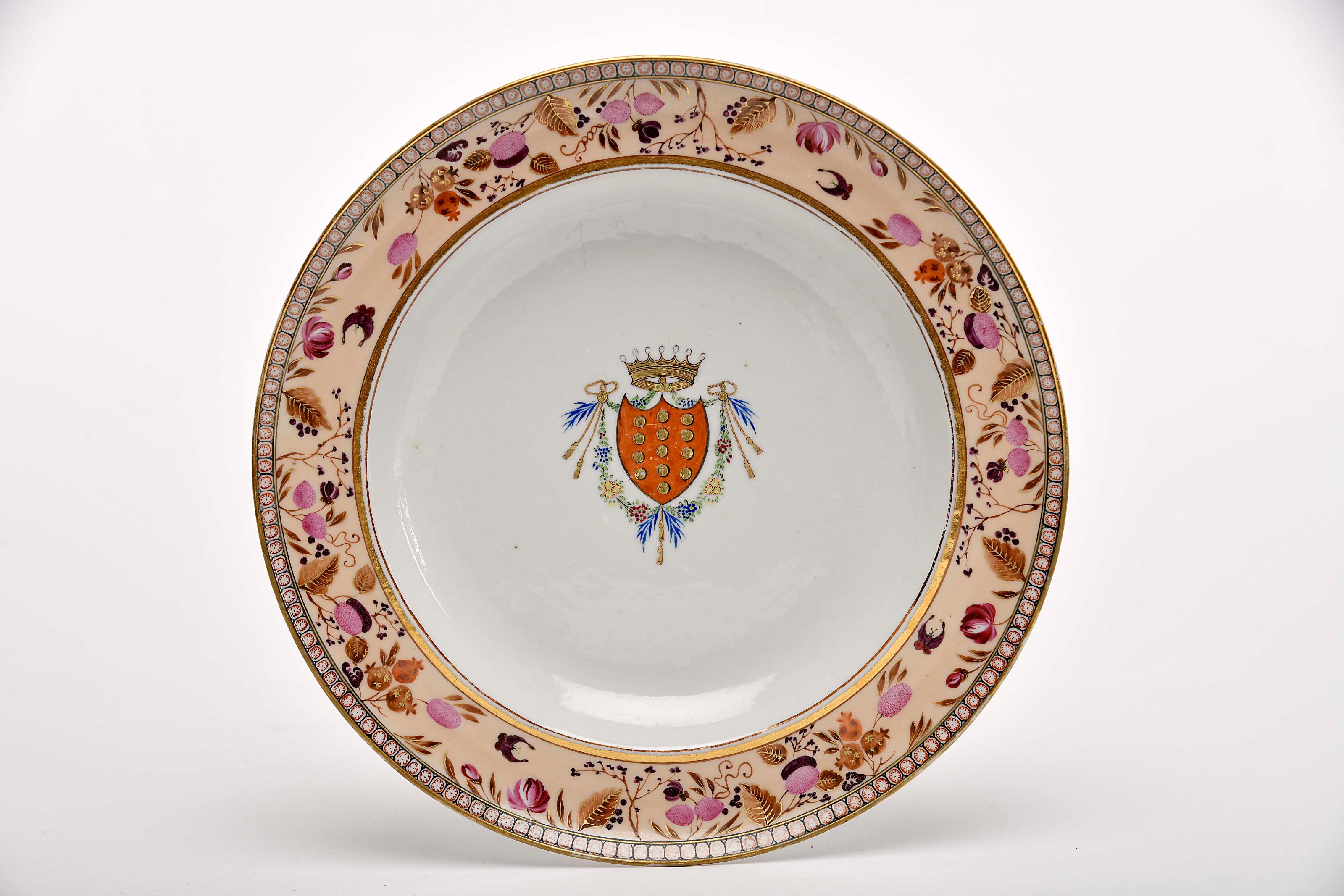 Prato de sopa porcelana Chinesa de exportação decoração policromada e dourada com armas de João Ferreira Sarmento (1792-1865), 1º barão, visconde e conde de Sarmento reinado Daoguang (1821-1850) ligeiro desgaste no dourado Dimensões (altura x comprimento x largura) - 25 cm Notas: vd. CASTRO, Nuno - "A Porcelana Chinesa ao Tempo do Império - Portugal/Brasil". Lisboa: ACD Editores, 2007, p. 226; e DIAS, Pedro - "Heráldica Portuguesa na Porcelana da China Qing". Lisboa: Fundação Macau, 2014, pp. 320-321.