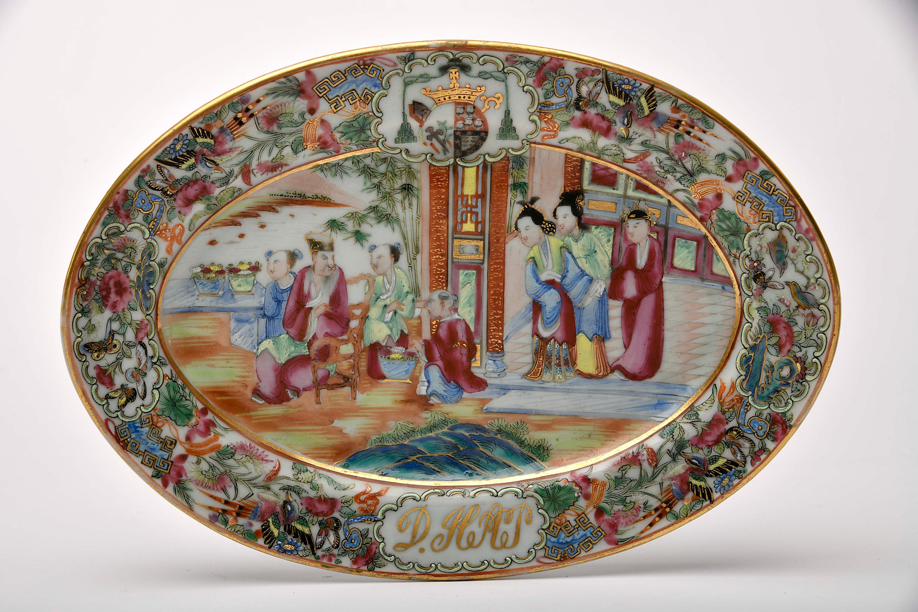 Travessa oval pequena porcelana Chinesa de exportação decoração policromada e dourada "Figuras chinesas, borboletas, aves e flores" com armas e monograma de D. João Crisóstomo de Amorim Pessoa (1810-1888), arcebispo de Goa e de Braga reinado Tongzhi (1862-1874) ligeiro desgaste no dourado Dimensões (altura x comprimento x largura) - 26 x 18,5 cm Notas: vd. CASTRO, Nuno de - "A Porcelana Chinesa ao Tempo do Império - Portugal/Brasil". Lisboa: ACD Editores, 2007, p. 235; SANTOS, A. Varela - "Portugal na Porcelana da China - 500 Anos de Comércio", vol. II. Lisboa: Artemágica, 2008, pp. 674-677; e DIAS, Pedro - "Heráldica Portuguesa na Porcelana da China Qing". Lisboa: Fundação Macau, 2014, pp. 326.