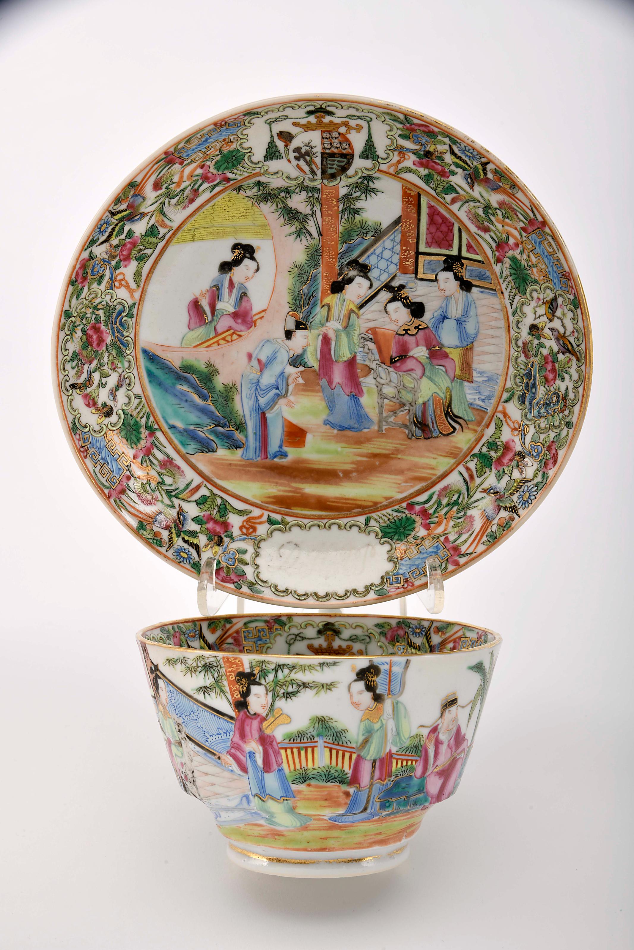 Chávena com pires porcelana Chinesa de exportação decoração policromada e dourada "Figuras chinesas, borboletas, aves e flores" com armas e monograma de D. João Crisóstomo de Amorim Pessoa (1810-1888), arcebispo de Goa e de Braga reinado Tongzhi (1862-1874) monograma muito desgastado, pequenos restauros na policromia, desgaste no dourado Dimensões (altura x comprimento x largura) - (chávena) 7 x 11,2 cm; (pires) 16,4 cm Notas: vd. CASTRO, Nuno de - "A Porcelana Chinesa ao Tempo do Império - Portugal/Brasil". Lisboa: ACD Editores, 2007, p. 235; SANTOS, A. Varela - "Portugal na Porcelana da China - 500 Anos de Comércio", vol. II. Lisboa: Artemágica, 2008, pp. 674-677; e DIAS, Pedro - "Heráldica Portuguesa na Porcelana da China Qing". Lisboa: Fundação Macau, 2014, pp. 326.Verso com etiqueta comercial J. REIS FERNANDES - LONDON.