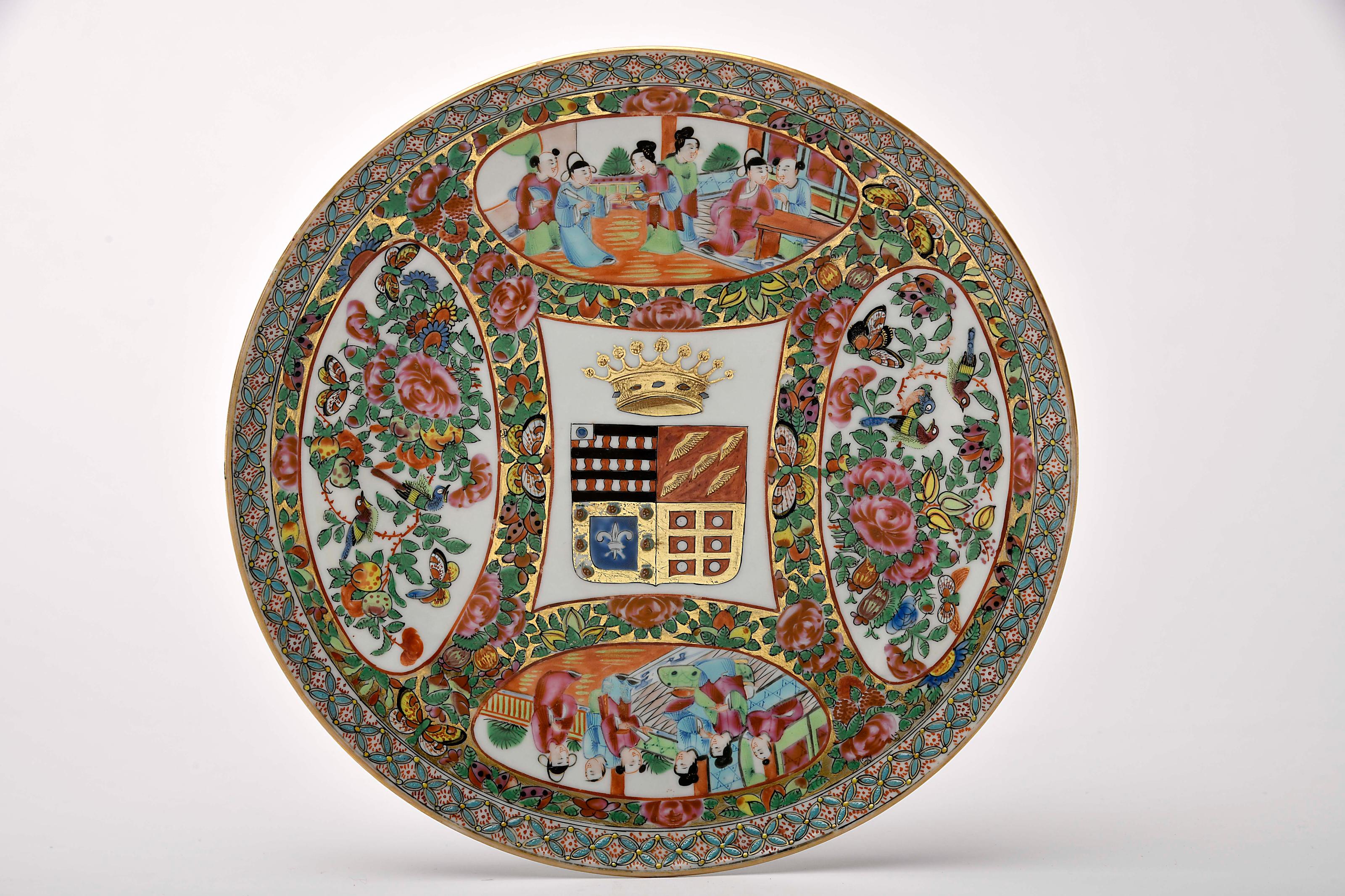 Prato porcelana Chinesa de exportação decoração «Mandarim» policromada e dourada "Aves, borboletas e flores" com armas de Luís Venâncio Carneiro de Vasconcelos (1808-1879) reinado Guangxu (1875-1908) ligeiro desgaste no dourado Dimensões (altura x comprimento x largura) - 24,3 cm Notas: vd. CASTRO, Nuno de - "A Porcelana Chinesa ao Tempo do Império - Portugal/Brasil". Lisboa: ACD Editores, 2007, p. 238; e DIAS, Pedro - "Heráldica Portuguesa na Porcelana da China Qing". Lisboa: Fundação Macau, 2014, pp. 328-329.Verso com etiqueta comercial de J. REIS FERNANDES - LONDON.