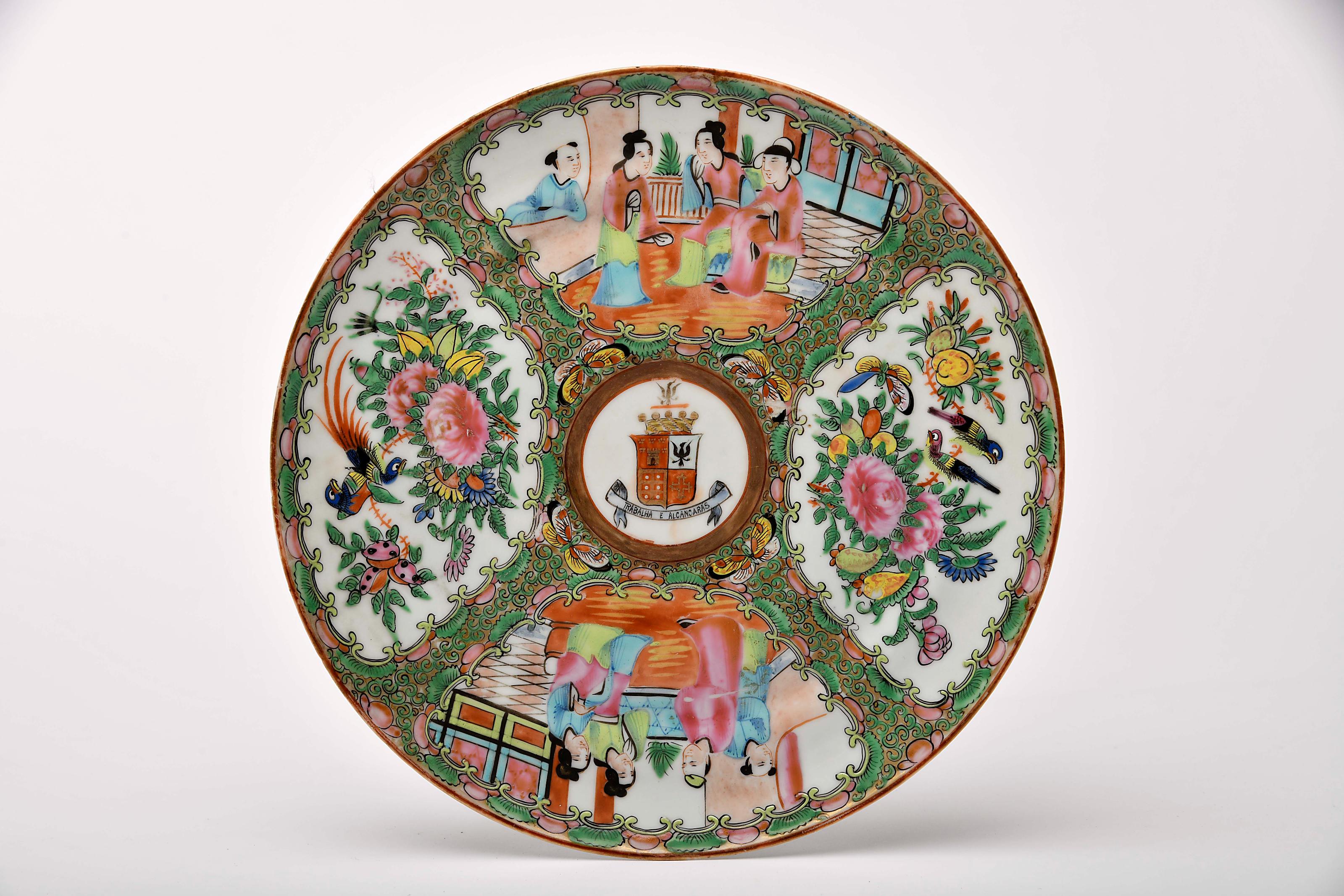 Prato porcelana Chinesa de exportação decoração «Mandarim» policromada e dourada com armas de José da Silva Loureiro (1836-1893) reinado Guangxu (1875-1908) pequenas esbeiçadelas Dimensões (altura x comprimento x largura) - 24 cm Notas: vd. CASTRO, Nuno de - "A Porcelana Chinesa ao Tempo do Império - Portugal/Brasil". Lisboa: ACD Editores, 2007, p. 242; e DIAS, Pedro - "Heráldica Portuguesa na Porcelana da China Qing". Lisboa: Fundação Macau, 2014, pp. 334-335.
