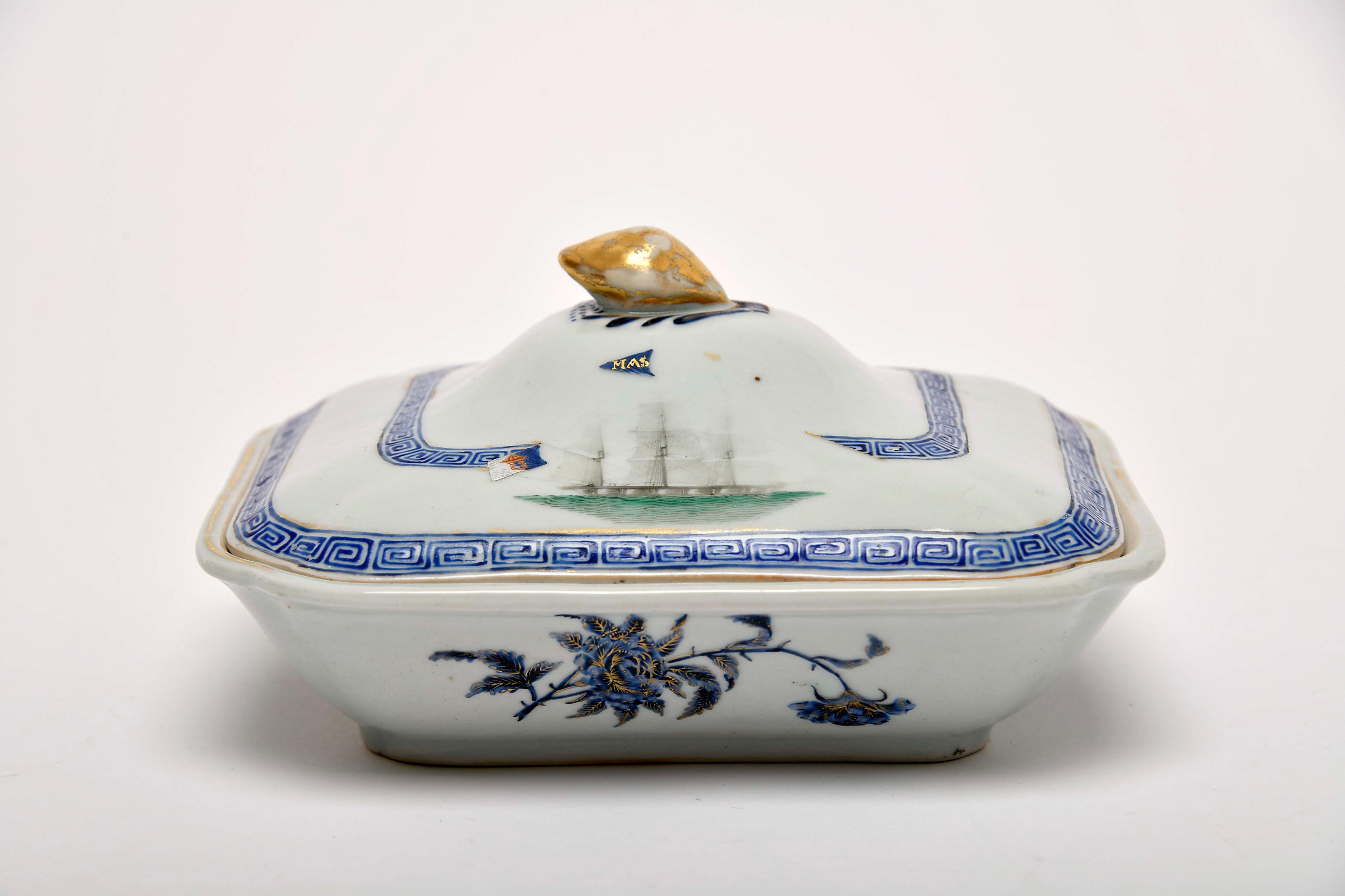 Prato coberto rectangular porcelana Chinesa de exportação decoração policromada e dourada "Veleiro com pavilhão da monarquia e bandeira com iniciais MAS" de Miguel António de Sousa (1786-1844) reinado Daoguang (1821-1850) pequeno restauro, pequeno desgaste na decoração Dimensões (altura x comprimento x largura) - 11 x 20,5 x 18 cm Notas: vd. CASTRO, Nuno - "A Porcelana Chinesa ao Tempo do Império - Portugal / Brasil". Lisboa: ACD Editores, 2007, p. 317, onde se refere que "Este serviço foi encomendado por João António Alves, comerciante, capitão de navios em Macau e dono do navio «Brilhante», para oferecer a seu tio Miguel António de Sousa, que graciosamente o havia financiado no início da sua carreira comercial. Conforme Jorge Forjaz - "Famílias Macaenses", I Volume, p. 164 e III Volume p. 878. Macau: 1996; e HERVOUET, François et Nicole; BRUNEAU, Yves - "La Porcelaine des Compagnies des Indes à décor Occidental". Paris: Flammarion, 1986, p. 46, nº 2.32.