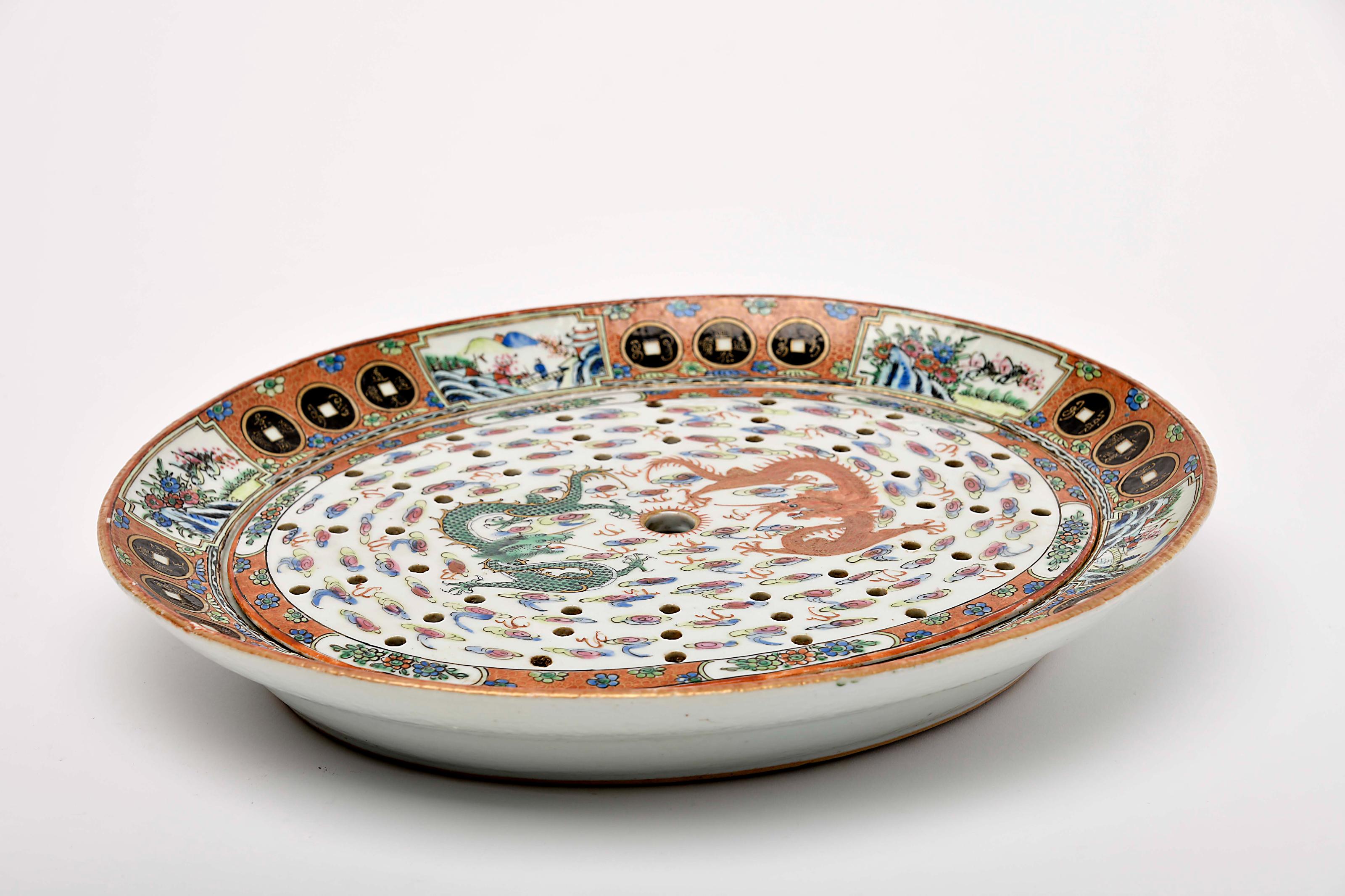 Travessa oval com grelha porcelana Chinesa de exportação decoração policromada e dourada com armas de Alberto de Magalhães Barros e Lançós Cerqueira de Araújo Queiroz (1871-1954) reinado Guangxu (1875-1908) ligeiro desgaste no dourado Dimensões (altura x comprimento x largura) - 5,5 x 37,7 x 31,3 cm Notas: vd. SOUZA, José de Campos e - "Loiça Brasonada - subsídios para a sua história". Porto: Livraria Fernando Machado, 1962, p. 143, Estampa XVI.