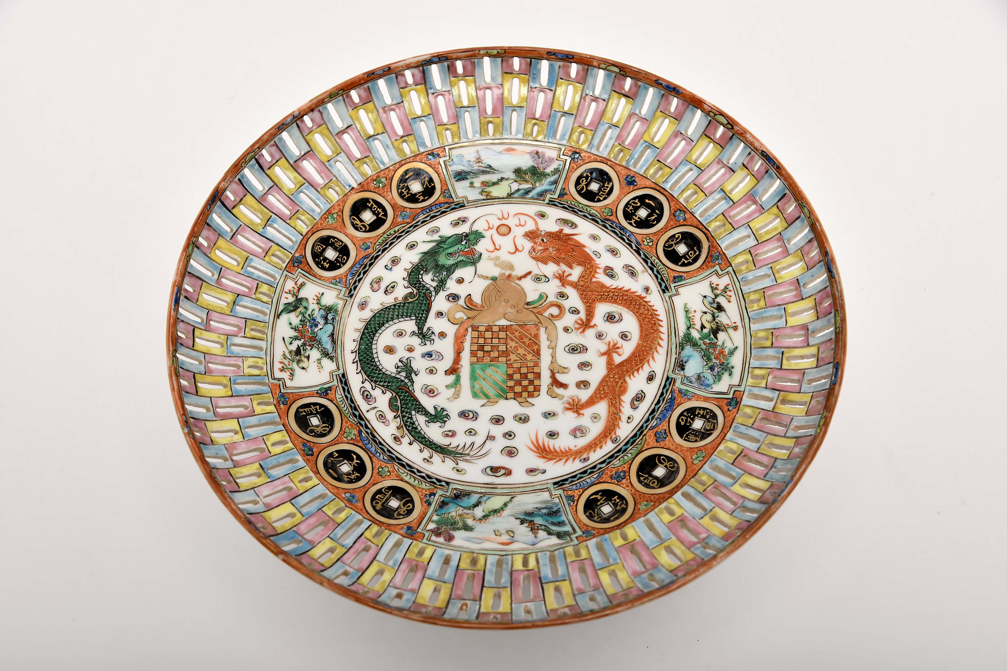 Fruteiro de pé alto com aba vazada porcelana Chinesa de exportação decoração policromada e dourada com armas de Alberto de Magalhães Barros e Lançós Cerqueira de Araújo Queiroz (1871-1954) reinado Guangxu (1875-1908) pequenos restauros na policromia, desgaste no dourado Dimensões (altura x comprimento x largura) - 11,3 x 26 cm Notas: vd. SOUZA, José de Campos e - "Loiça Brasonada - subsídios para a sua história". Porto: Livraria Fernando Machado, 1962, p. 143, Estampa XVI.
