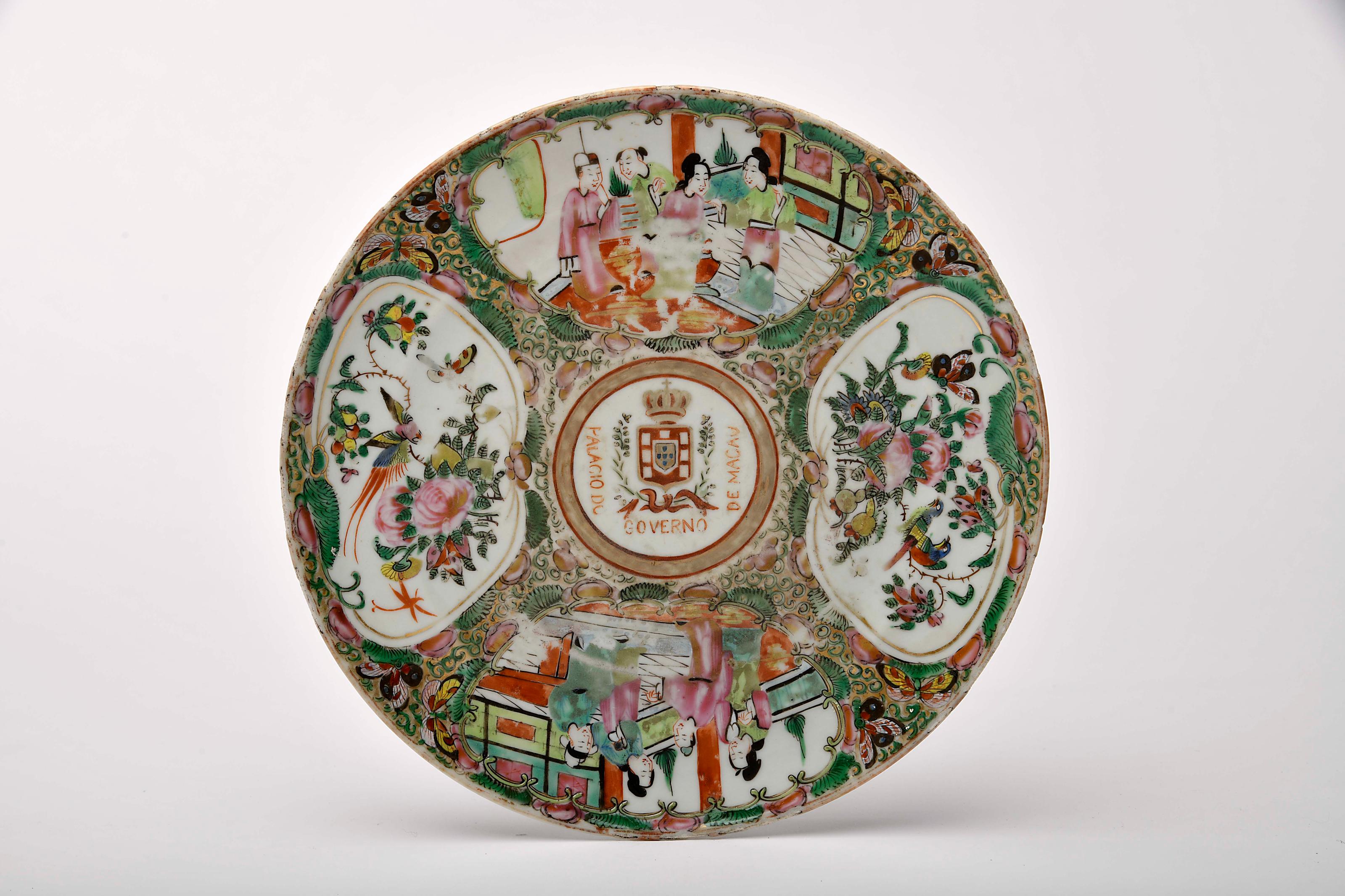 Prato porcelana Chinesa de exportação decoração «Mandarim», policromada e dourada com Armas do Reino de Portugal e inscrição PALÁCIO DO GOVERNO DE MACAU reinado Guangxu (1875-1908) restauro, pequenas esbeiçadelas e pequenas faltas no vidrado do bordo, desgaste na decoração e no dourado Dimensões (altura x comprimento x largura) - 25 cm Notas: vd. Nuno de Castro in "A Porcelana Chinesa ao Tempo do Império - Portugal/Brasil". Lisboa: ACD Editores, 2007, p. 239.