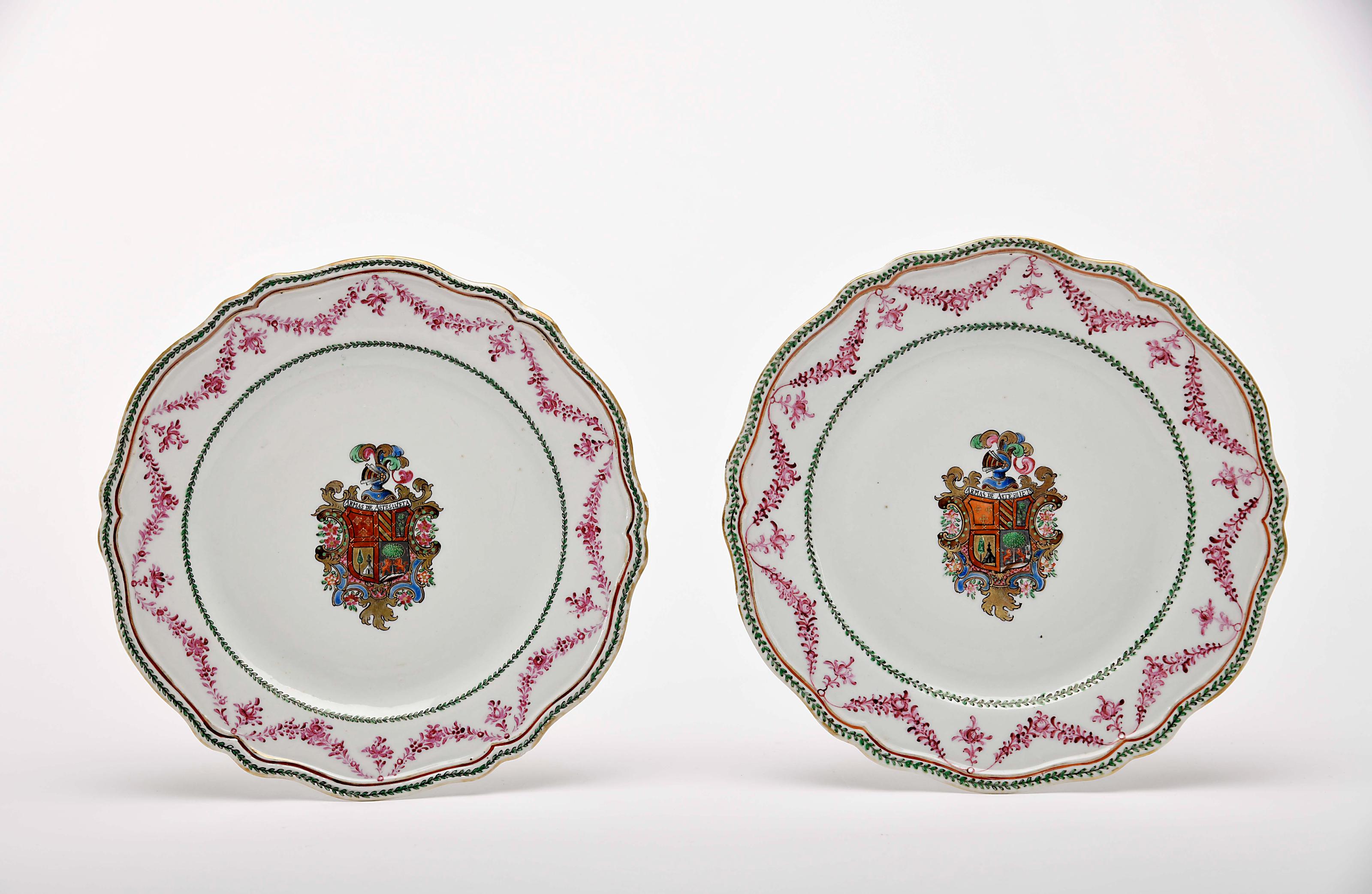 Par de pratos recortados porcelana Chinesa de exportação decoração policromada e dourada "Grinaldas de flores" com armas de Pedro Lamberto de Asteguieta (1706-1774) reinado Qianlong (1736-1795) pequenas esbeiçadelas Dimensões (altura x comprimento x largura) - (o maior) 25 cm Notas: vd. DIAZ, Rocio - "Chinese Armorial Porcelain for Spain". Lisboa/Londres: Jorge Welsh Books - Publishers and Booksellers, 2010, pp. 236-243, nº 34.