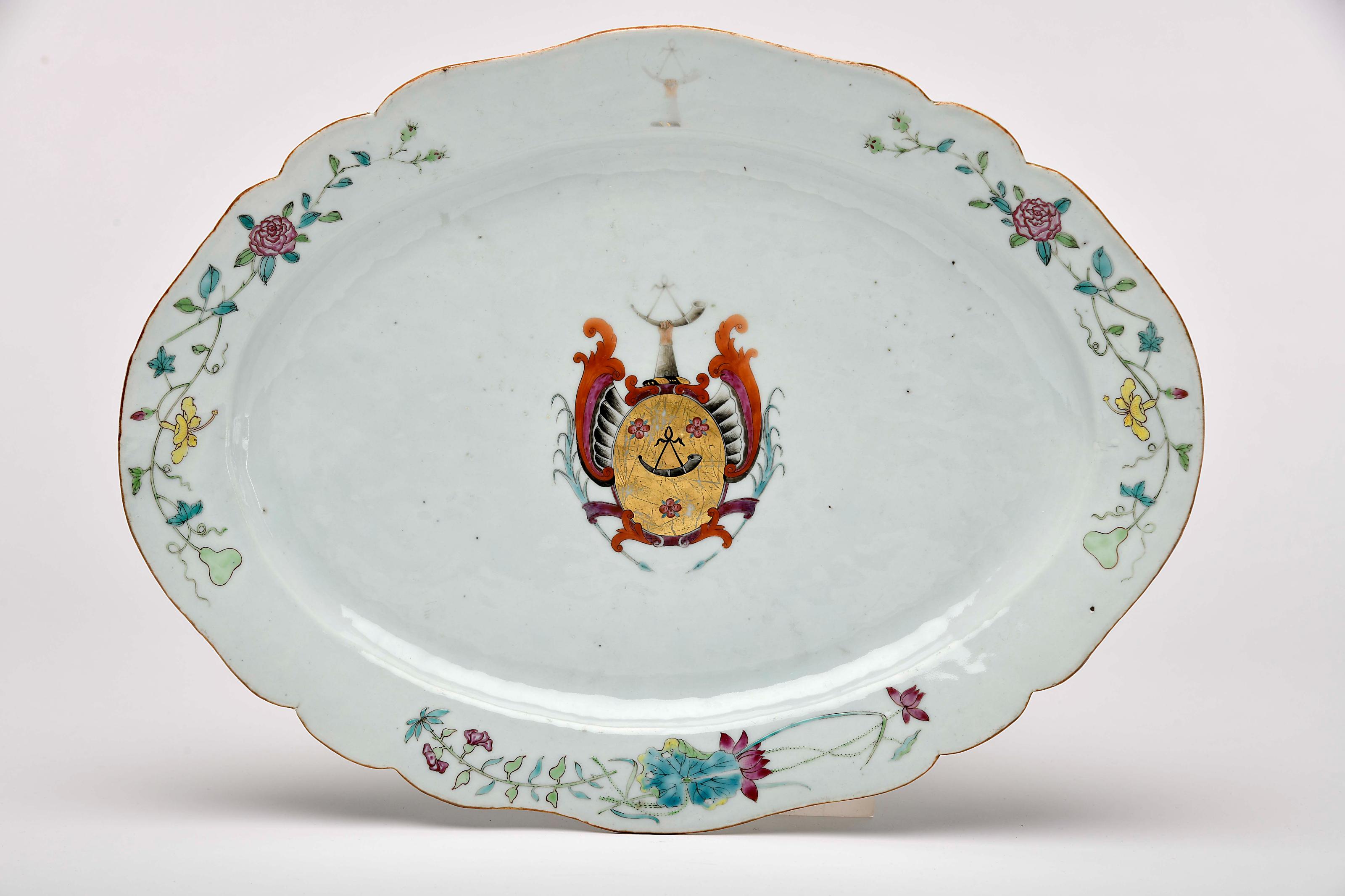 Travessa recortada porcelana Chinesa de exportação decoração policromada e dourada com armas da família Bagshawe reinado Qianlong (1736-1795) desgaste na decoração Dimensões (altura x comprimento x largura) - 41 x 31 cm Notas: vd. HOWARD, David Sanctuary - "Chinese Armorial Porcelain - volume I". Londres: Faber and Faber Limited, 1974, p. 399, O4.