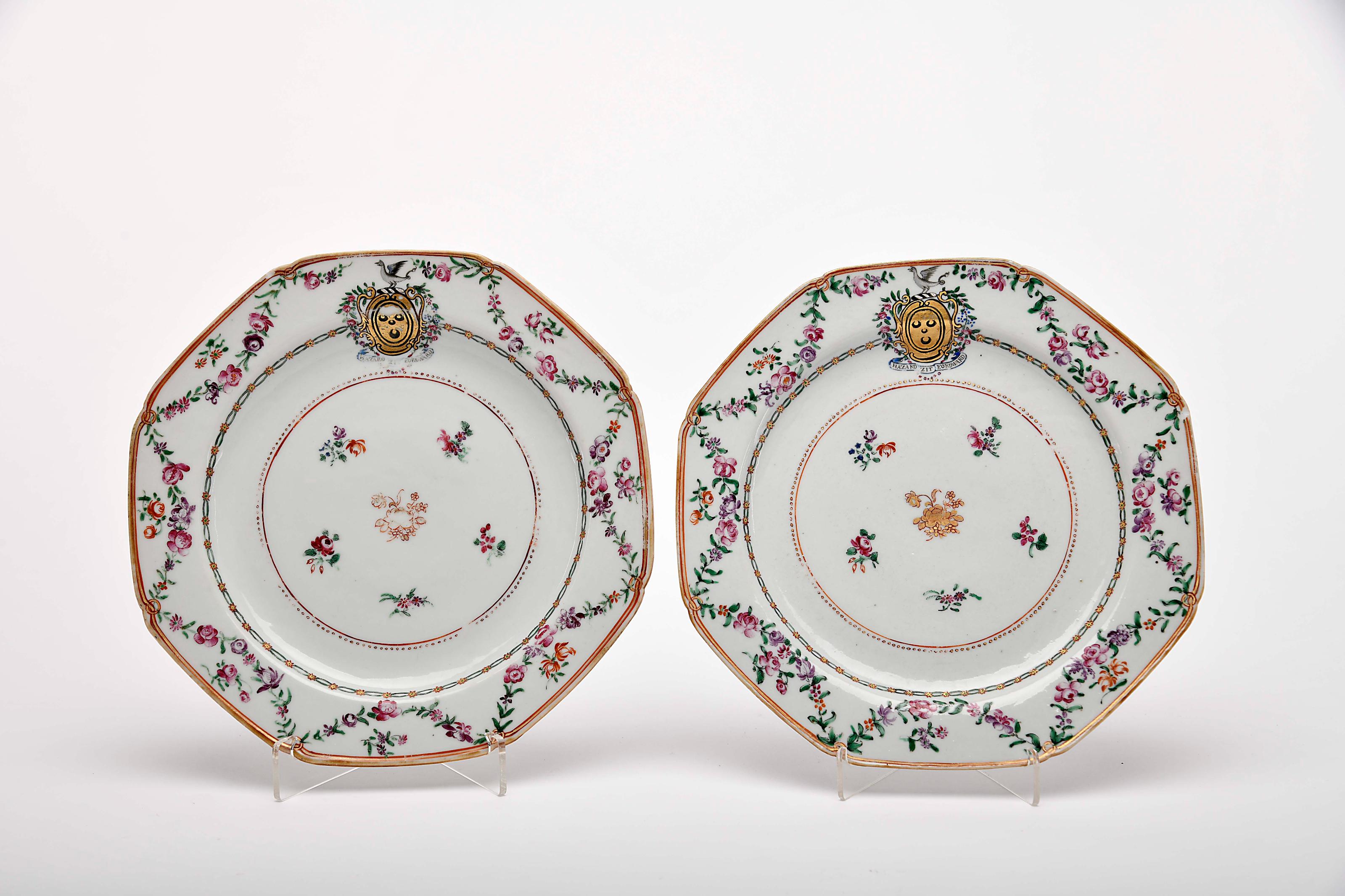 Par de pratos oitavados porcelana Chinesa de exportação decoração policroma e dourada "Flores", aba com armas da família Seton reinado Qianlong (1736-1795) pequenas esbeiçadelas, desgaste no dourado Dimensões (altura x comprimento x largura) - 22 cm Notas: vd. HOWARD, David Sanctuary - "Chinese Armorial Porcelain - volume I". Londres: Faber and Faber Limited, 1974, p. 620, S3.