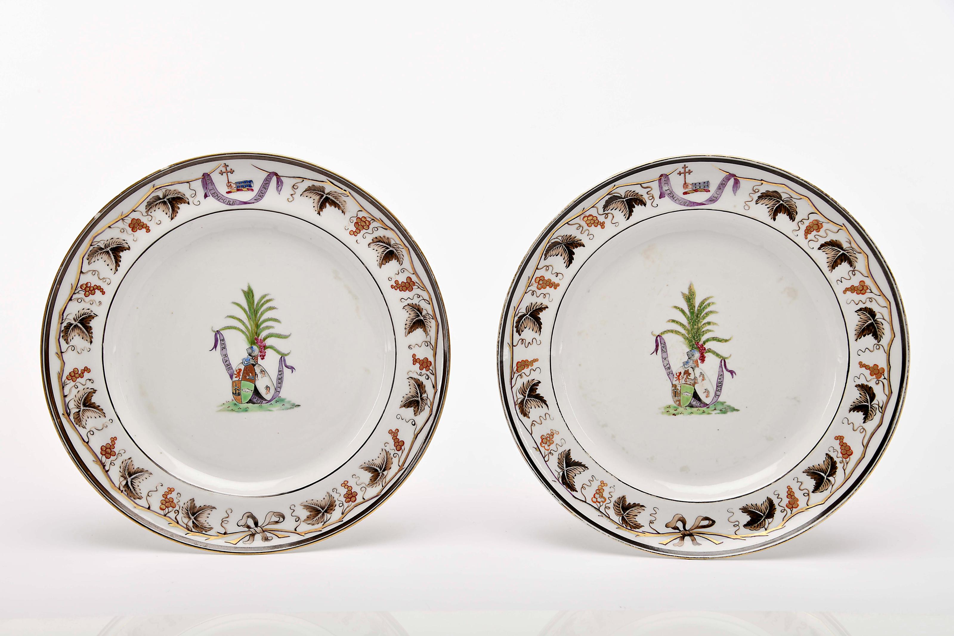 Par de pratos porcelana Chinesa de exportação decoração policromada e dourada "Cachos e parras de uvas" com armas das famílias MacDonald e (provavelmente) Forbes com divisa PER MARE PER TERRAS, listel com inscrição NEC TEMPORE, NEC FATO reinado Jiaqing (1796-1820) um prato com cabelo e esbeiçadelas consolidadas, ínfimas esbeiçadelas, ligeiro desgaste na decoração Dimensões (altura x comprimento x largura) - 24,7 cm Notas: vd. HOWARD, David Sanctuary - "Chinese Armorial Porcelain - volume I". Londres: Faber and Faber Limited, 1974, p. 279, F11.