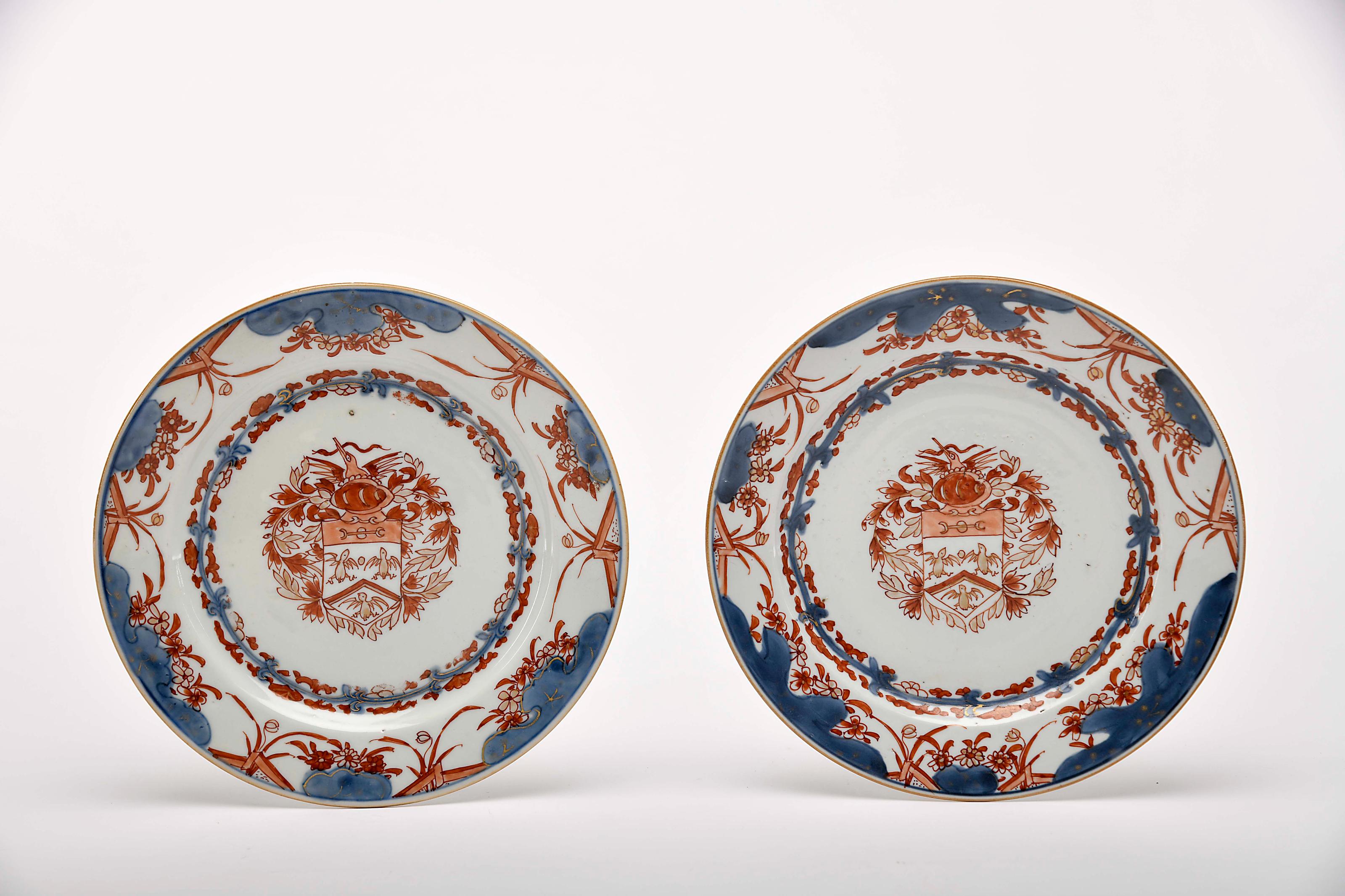 Par de pratos porcelana Chinesa de exportação decoração «rouge-de-fer», azul e dourado "Flores" com armas da família holandesa van Gellicum reinado Kangxi (1662-1722)/reinado Yongzheng (1722-1735) esbeiçadelas, ligeiro desgaste no dourado Dimensões (altura x comprimento x largura) - 22 cm Notas: vd. https://www.bada.org/object/chinese-armorial-plates-van-gellicum-kangxi-period-1720-30 - consultado a 26-5-2025, às 11:19.