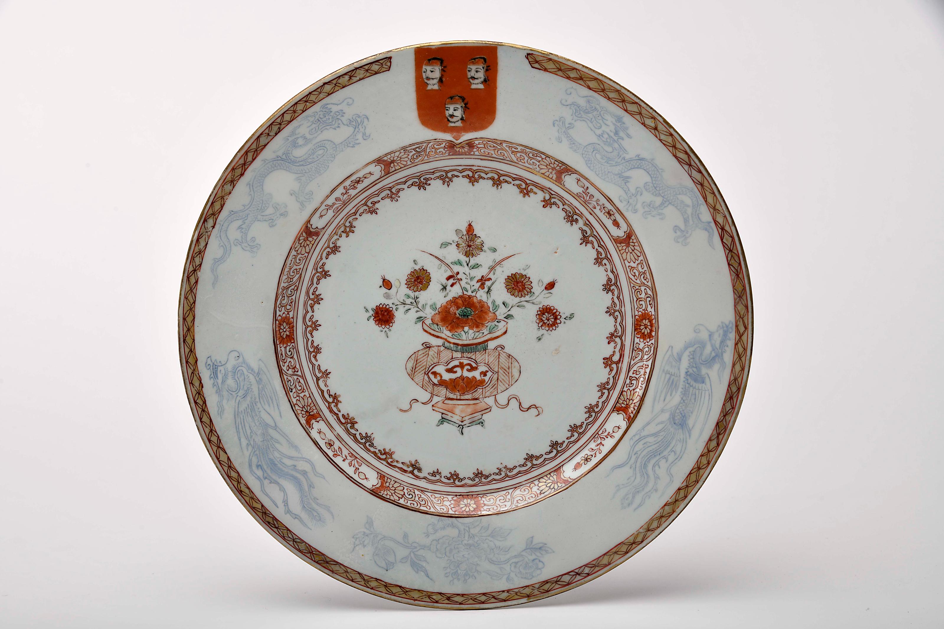 Prato porcelana Chinesa de exportação decoração a sépia e dourado "Jarro com flores", aba com decoração a azul "Dragões, fénix e flores" e armas da família Fazakerley, verso com decoração "Flores" reinado Kangxi (1662-1722) muitos cabelos, pequenas esbeiçadelas, desgaste no dourado Dimensões (altura x comprimento x largura) - 28,5 cm Notas: vd. HOWARD, David Sanctuary - "Chinese Armorial Porcelain" – vol. II. Londres: Heirloom & Howard Limited, 2003, p. 147, D5.