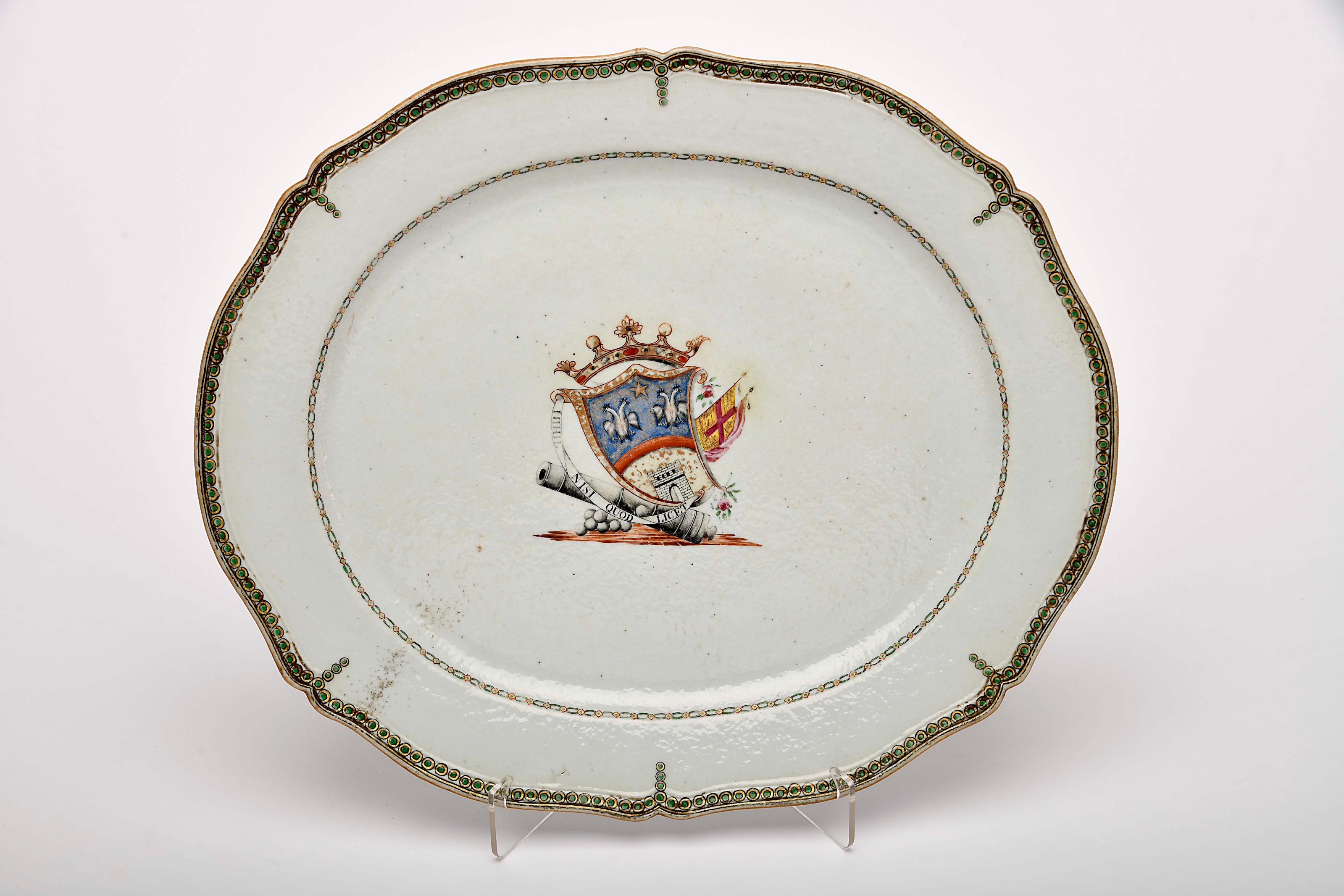 Travessa oval recortada porcelana Chinesa de exportação decoração policromada e dourada com armas de família europeia sobre troféus e divisa NIHIL NISI QUOD LICET reinado Qianlong (1736-1795) ligeiro desgaste na decoração Dimensões (altura x comprimento x largura) - 37,5 x 31,5 cm
