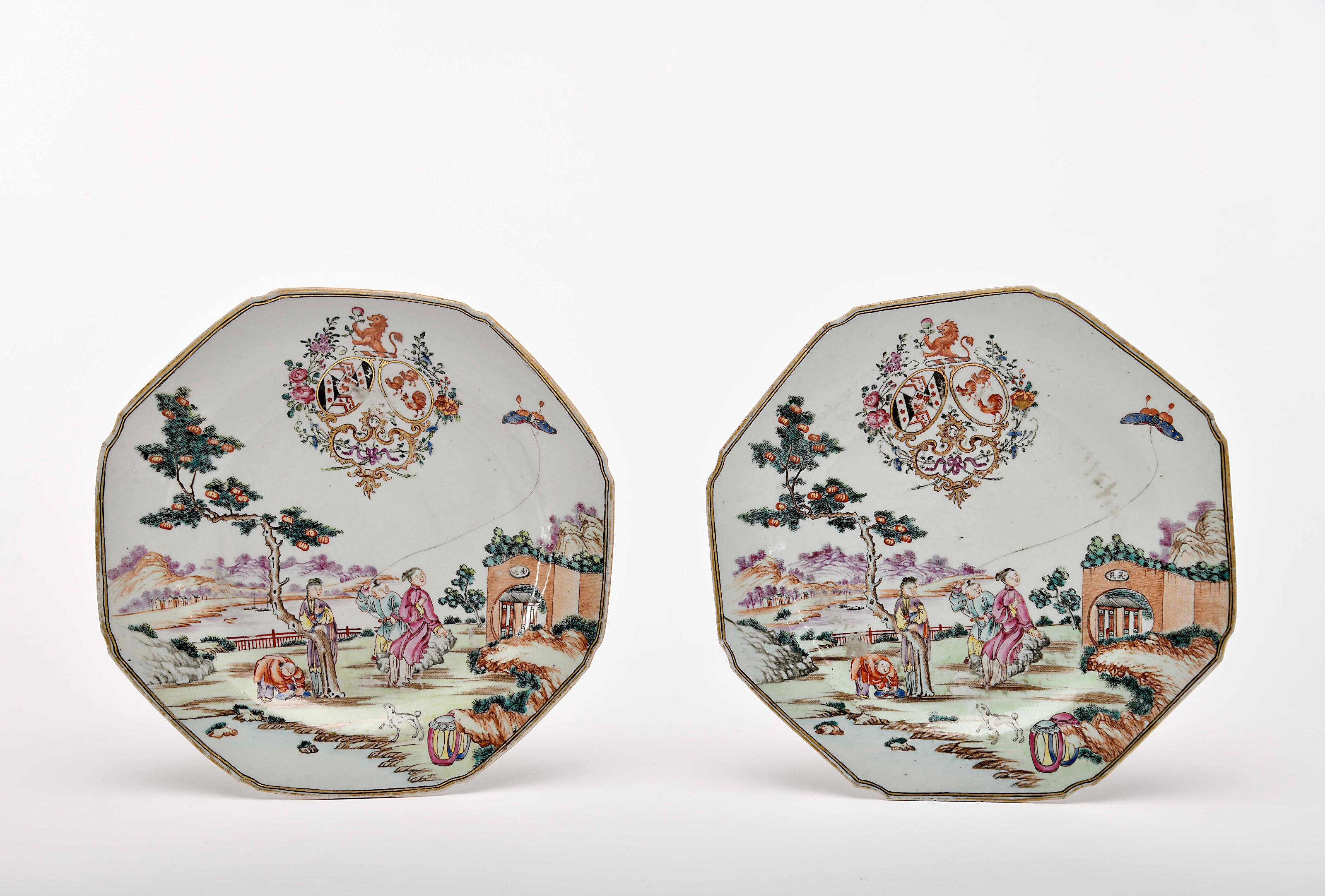 Par de pratos oitavados porcelana Chinesa de exportação decoração policromada e dourada "Jardim com figuras chinesas" e dois escudos com armas: 1º escudo esquartelado com armas de Peach e de Small com sobre-o-todo de Cockburn; 2º armas plenas de Cockburn; timbre de Peach reinado Qianlong (1736-1795) pequenas esbeiçadelas, ligeiro desgaste na decoração Dimensões (altura x comprimento x largura) - 22 cm Notas: vd. HOWARD, David Sanctuary - "Chinese Armorial Porcelain". London, Faber and Faber Limited, 1974, p. 346, K6.