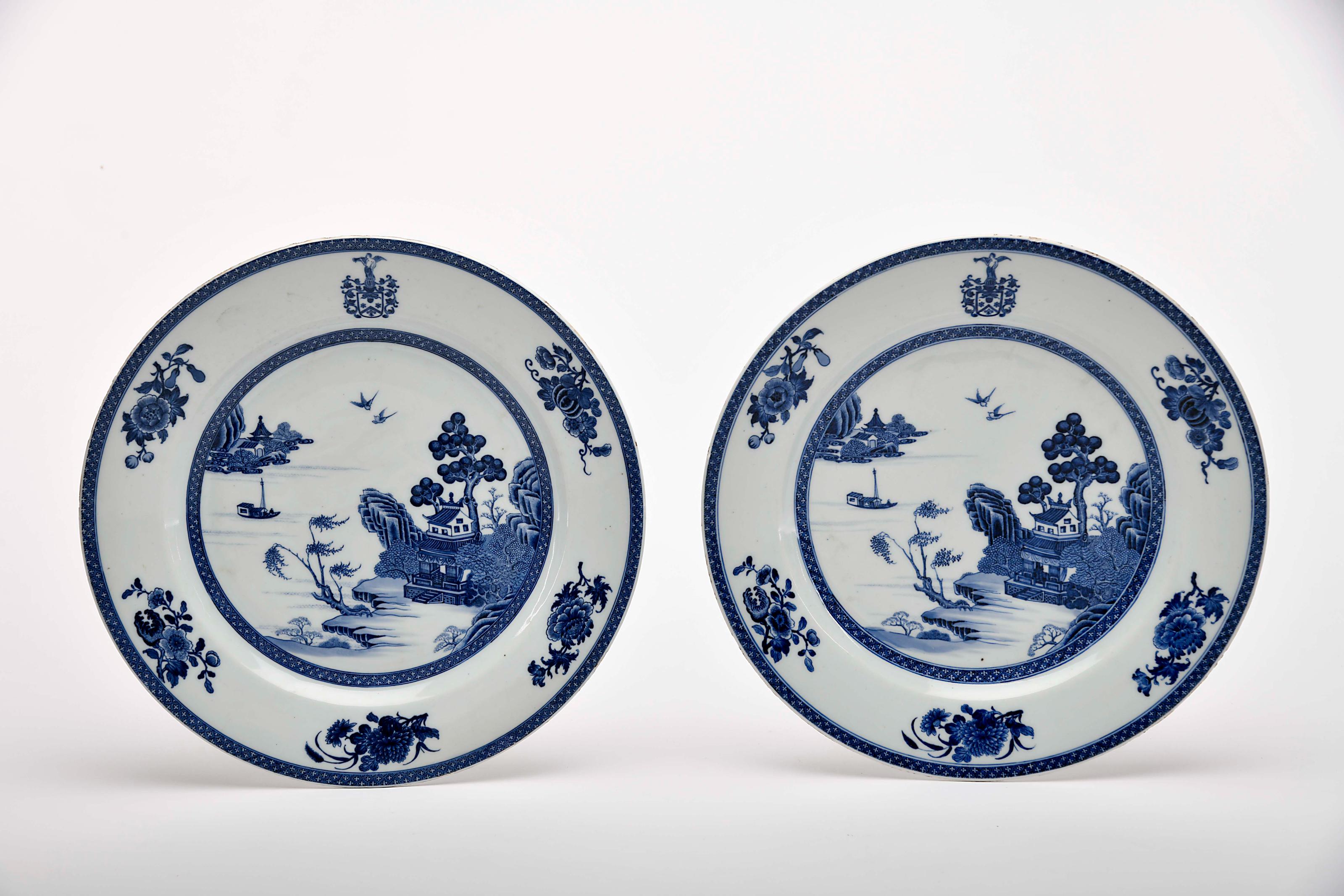 Par de pratos porcelana Chinesa de exportação decoração a azul "Paisagem com pagode junto a rio", aba com armas de família europeia reinado Qianlong (1736-1795) pequenas esbeiçadelas Dimensões (altura x comprimento x largura) - 32 cm