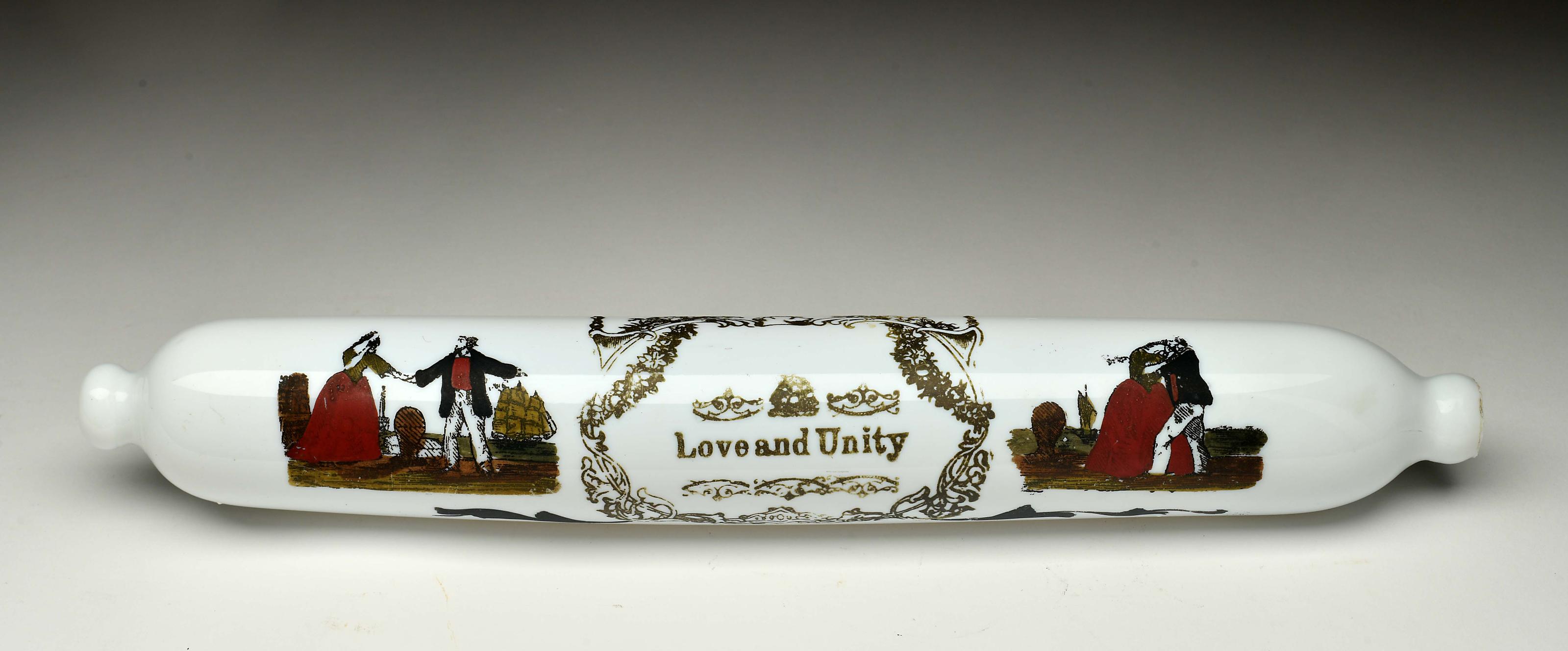 Rolo da massa vidro coalhado de Nailsea decoração policromada "Paisagem com casal e barcos" com inscrição LOVE AND UNITY Inglês séc. XIX pequenas faltas na decoração Dimensões (altura x comprimento x largura) - 36,5 cm