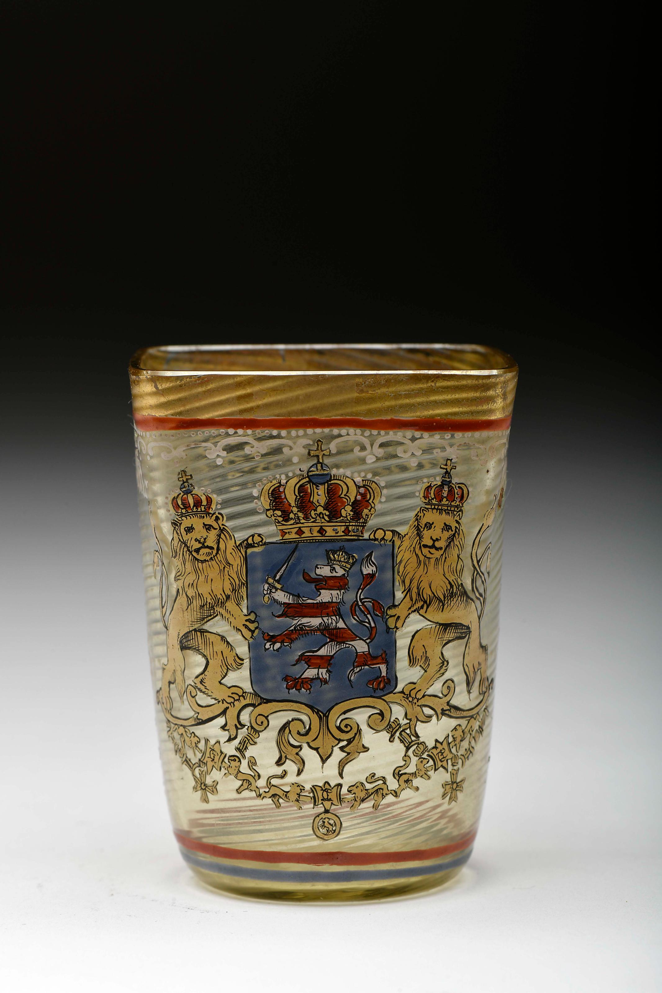 Copo quadrangular à maneira veneziana vidro pintado decoração espiralada, policromada e dourada com armas de Hesse encimadas por coronel de landgrave com inscrição FRIEDRICH LANDGRAF ZV HESSEN CASSEL 1675 ligeiro desgaste no dourado Dimensões (altura x comprimento x largura) - 8,2 cm Notas: Frederico (1676-1751) foi Landgrave de Hesse-Kassel (1730-1751) e Frederico I, rei da Suécia (1720-1751).