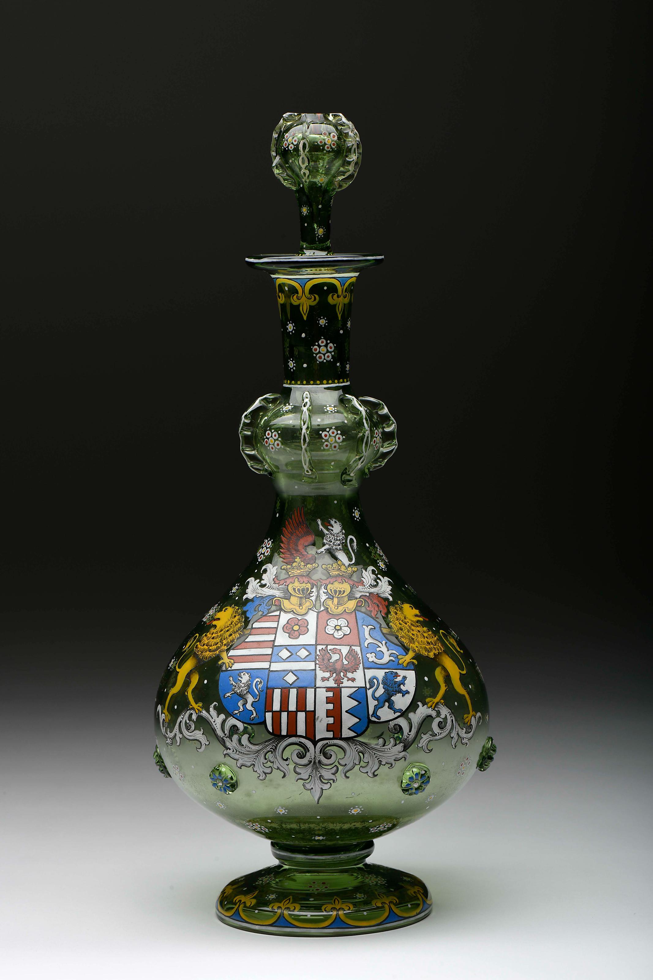 Garrafa bojuda com tampa vidro verde pintado decoração relevada e policromada com armas de família alemã séc. XVII/XVIII faltas nos relevos Dimensões (altura x comprimento x largura) - 34,5 cm
