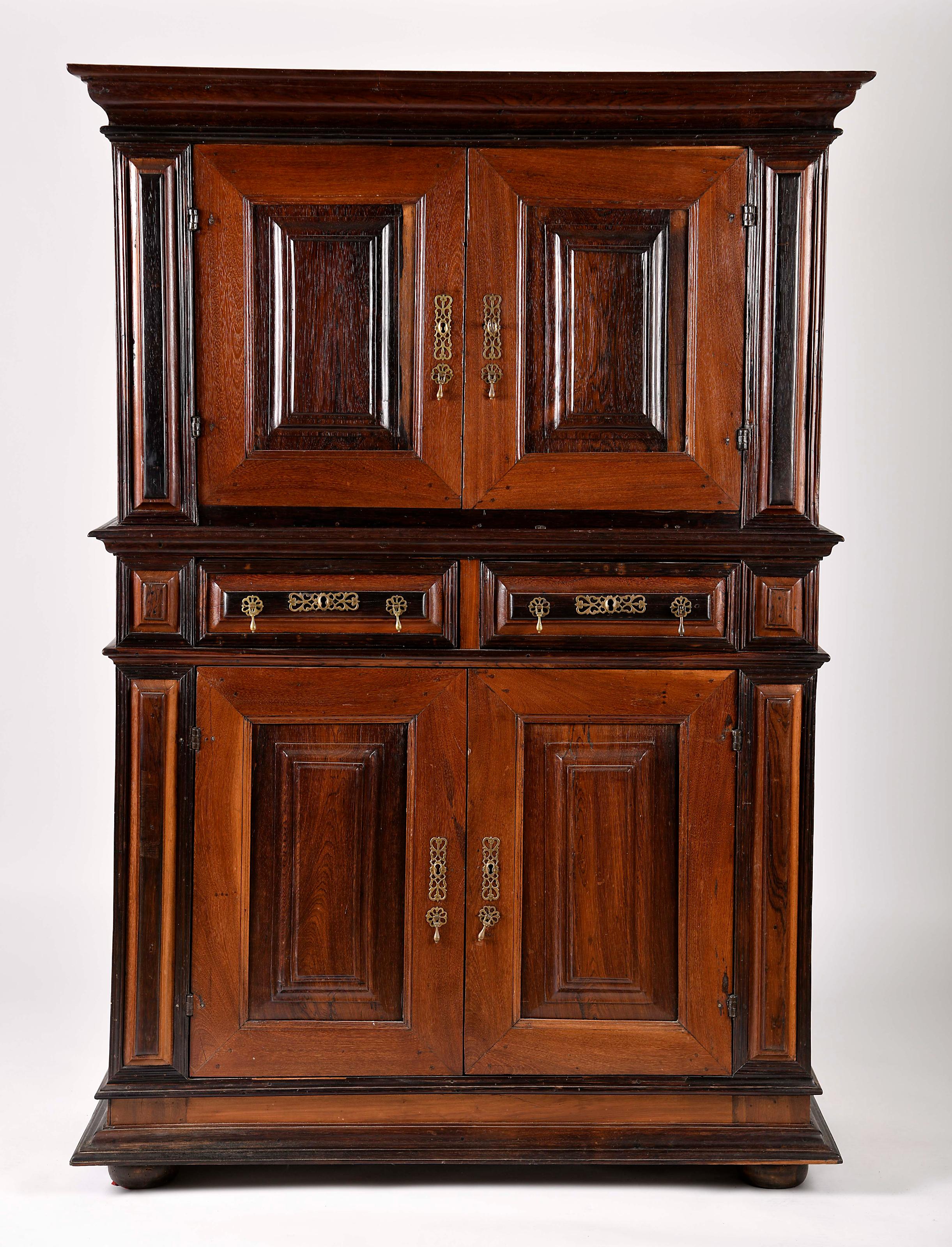 Armário copeiro maneirista pau-santo, angelim vermelho e vinhático interior do corpo superior com duas galerias, ferragens vazadas em bronze Português séc. XVII pequenos restauros, fissuras, pequenas faltas e defeitos, ligeiros vestígios de insectos xilófagos Dimensões (altura x comprimento x largura) - 192 x 132 x 56 cm Notas: vd. exemplar semelhante em "Mobiliário das Colecções Particulares de Arouca". Arouca: Associação para a Defesa da Cultura Arouquense/Museu de Aveiro, Setembro de 1986, p. 29, nº 18.