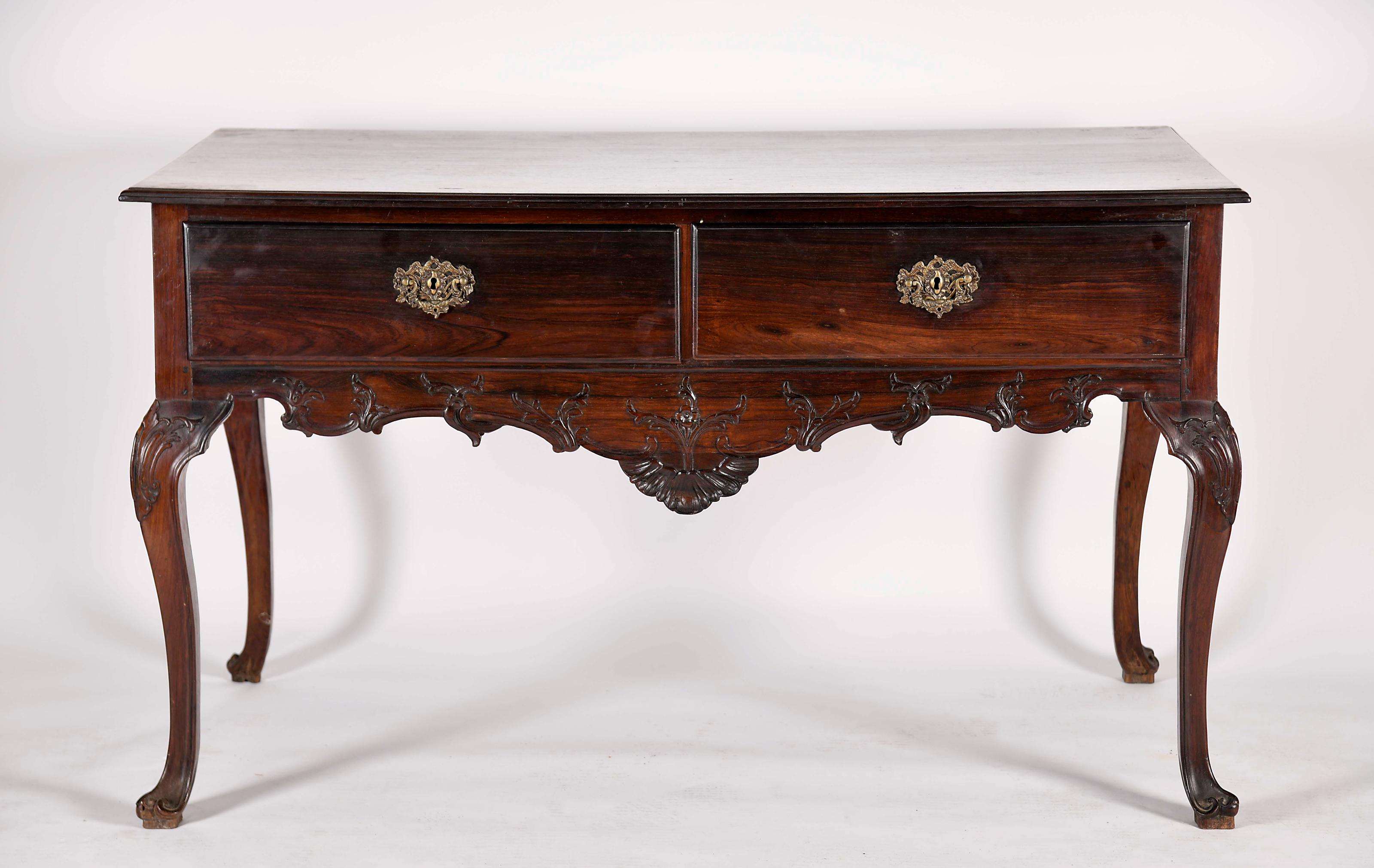 Mesa de centro D. José (1750-1777) pau-santo com entalhamentos ferragens em bronze relevado Portuguesa pequena falta num pé, outras pequenas faltas e defeitos Dimensões (altura x comprimento x largura) - 81 x 137 x 75 cm