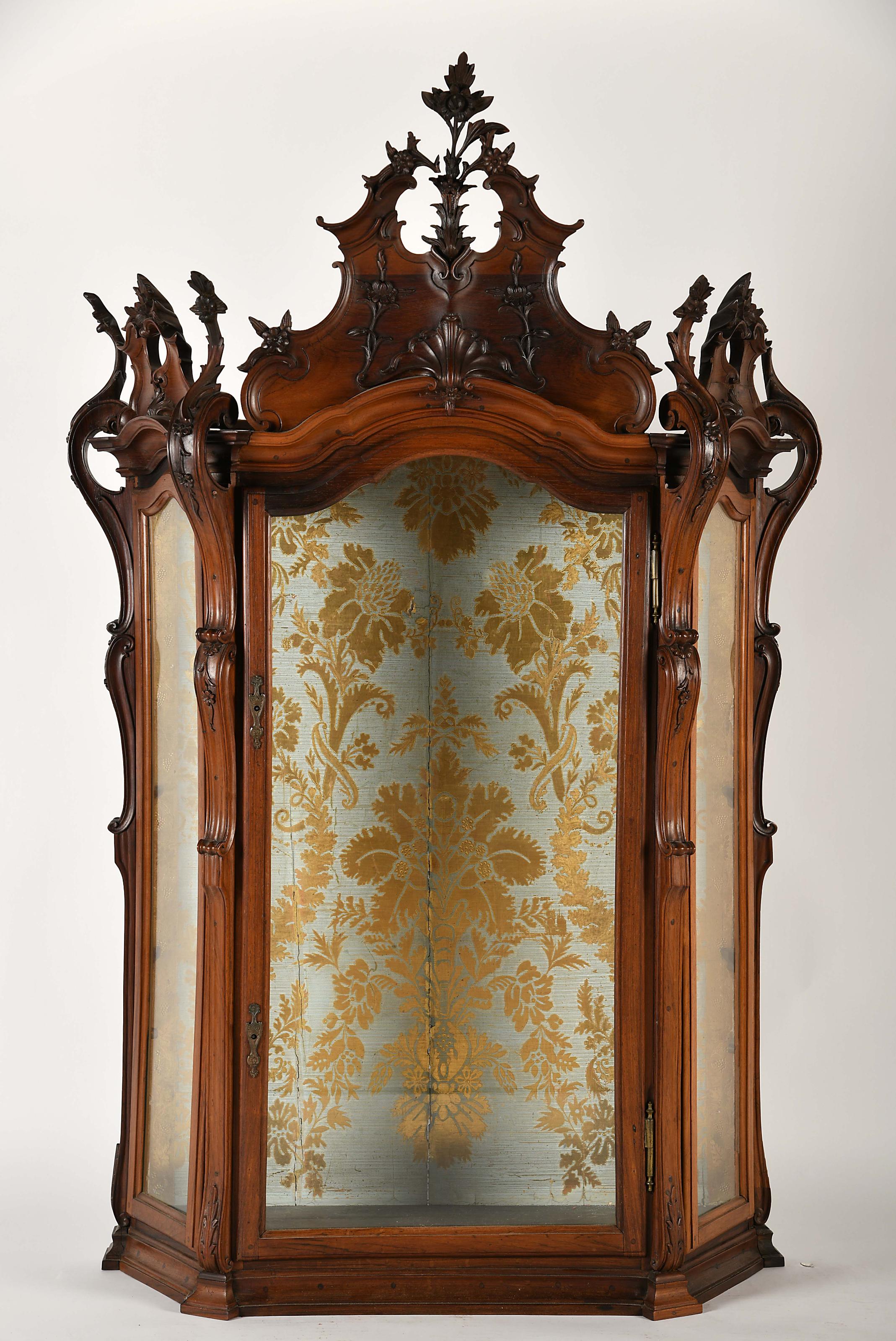 Oratório D. José (1750-1777) pau-santo com entalhamentos interior dourado e pintado "Flores" Português restauros, pequenas faltas e defeitos, vestígios de insectos xilófagos, adaptado a vitrine, falta da prateleiras Dimensões (altura x comprimento x largura) - 140 x 86 x 28 cm Notas: vd. exemplar semelhante em FREIRE, Fernanda Castro - "Mobiliário - II volume". Lisboa: Fundação Ricardo do Espirito Santo Silva, Museu-Escola de Artes Decorativas Portuguesas, 2002, p. 148.
