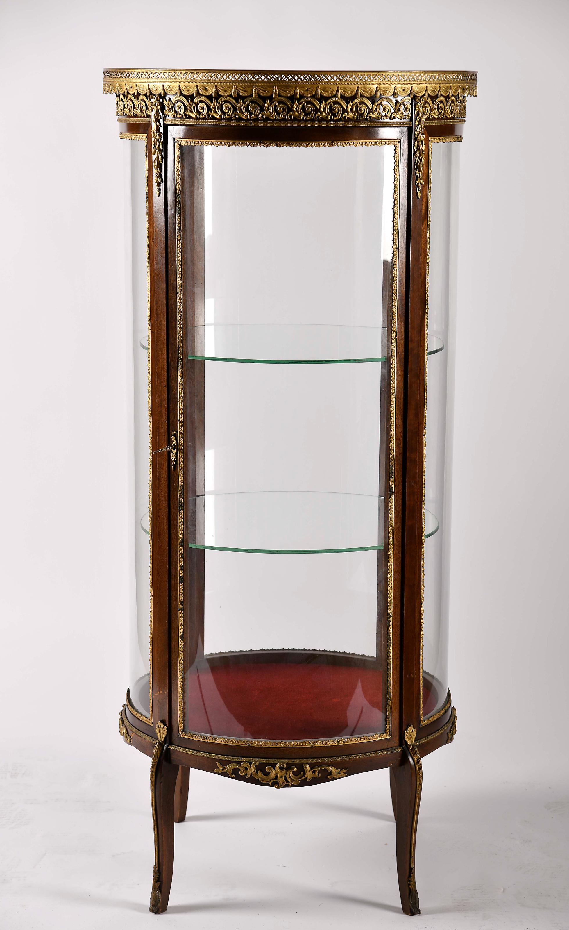 Vitrine cilíndrica Napoleão III (1848-1870) mogno aplicações em bronze relevado e dourado, vidros convexos, interior com prateleiras de vidro, tampo de mármore com gradinha em latão relevado e dourado Francesa fissura num canto de um vidro Dimensões (altura x comprimento x largura) - 146 x 65 cm