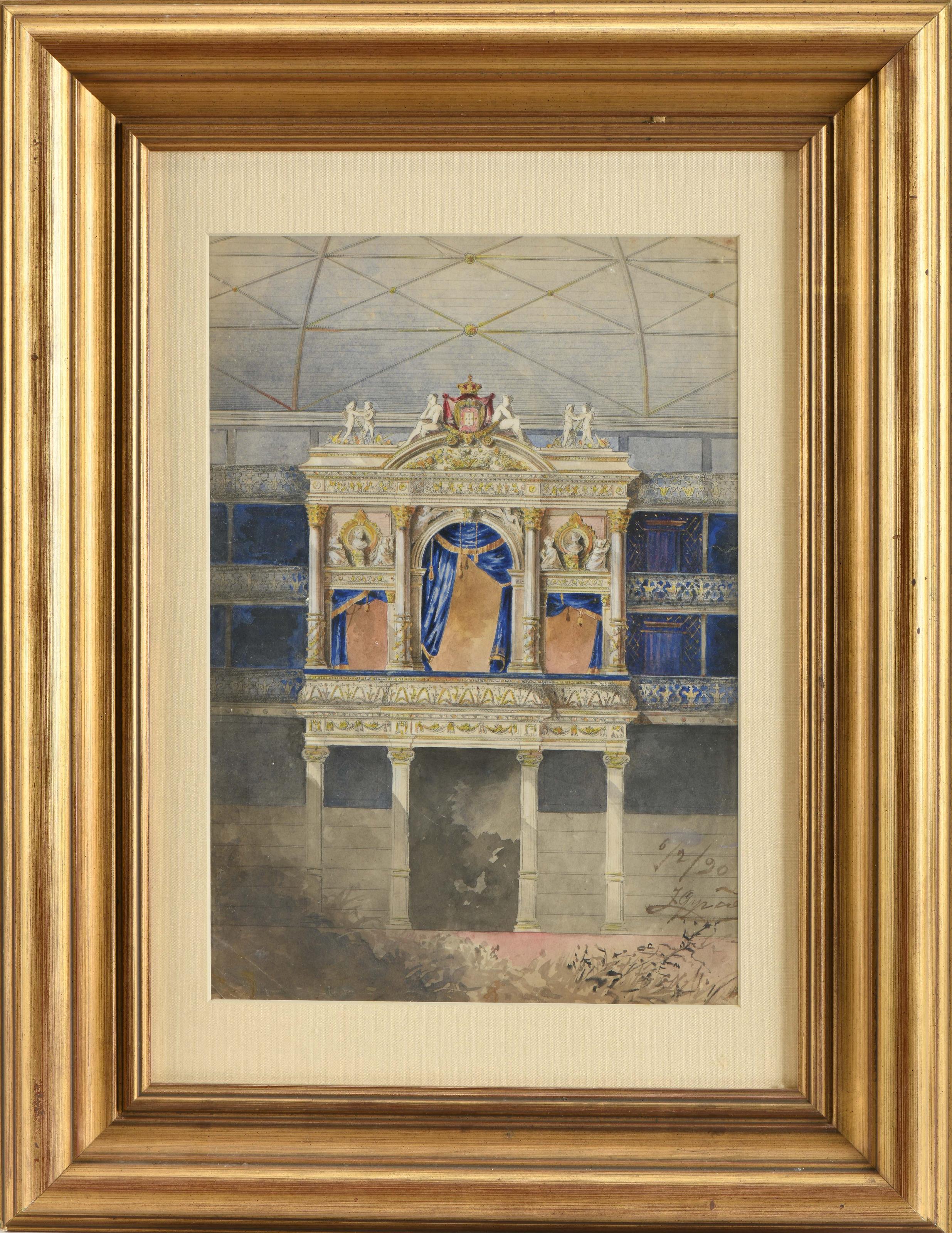 JOSÉ MOURA GYRÃO - 1840-1916 "Camarote Real do Coliseu dos Recreios - Lisboa" aguarela sobre papel pequeno defeito no suporte assinada e datada de 6-2-[18]90 Dimensões (altura x comprimento x largura) - 44 x 30,5 cm