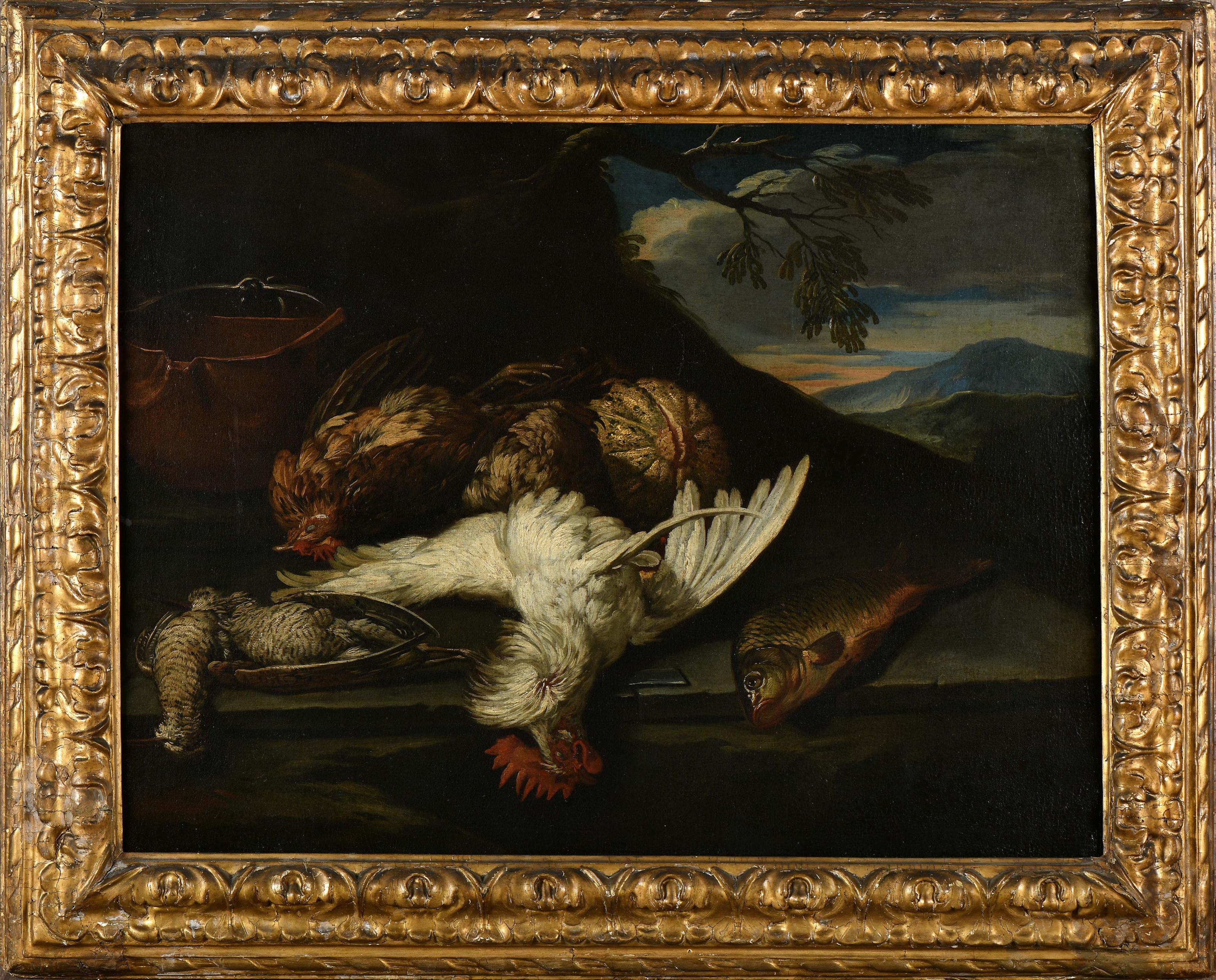 Natureza-morta - Aves, peixe e cobre com paisagem em fundo óleo sobre tela escola Holandesa séc. XVII reentelado, pequenos restauros Dimensões (altura x comprimento x largura) - 85 x 114 cm